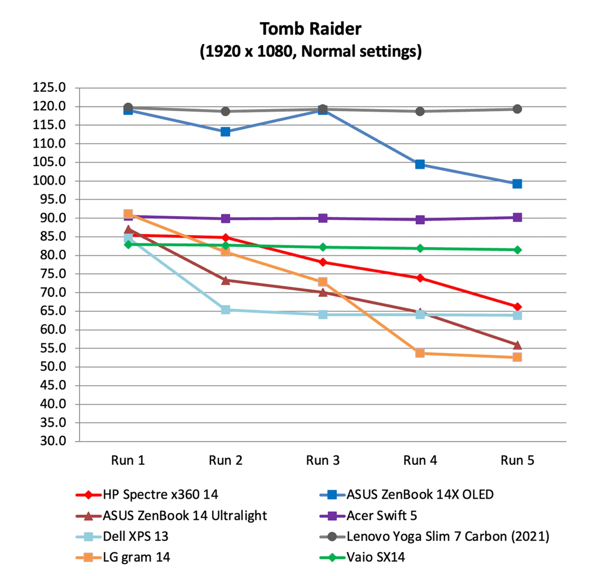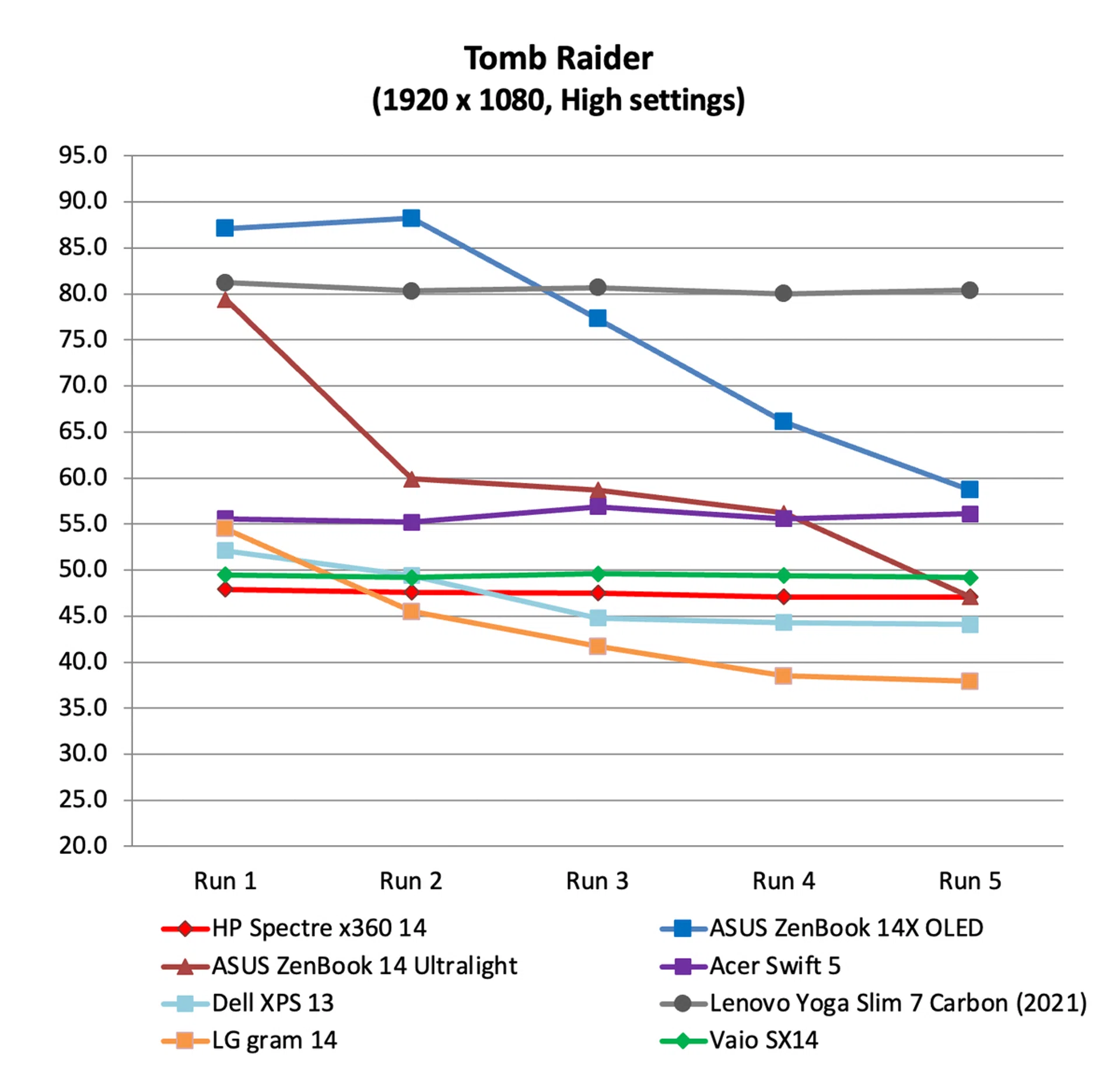 Performance was mostly average. Its scores across PCMark 10, CPU-intensive benchmarks like Geekbench and Cinebench, and even its gaming scores, were all toward the middle of the pack. The only area of concern would be its below average storage benchmark score and speed. On gaming benchmarks, it also showed that it resisted throttling quite well as evidenced by its mostly consistent performance on Tomb Raider. That said, when running Tomb Raider, it did get really loud and warm to touch.