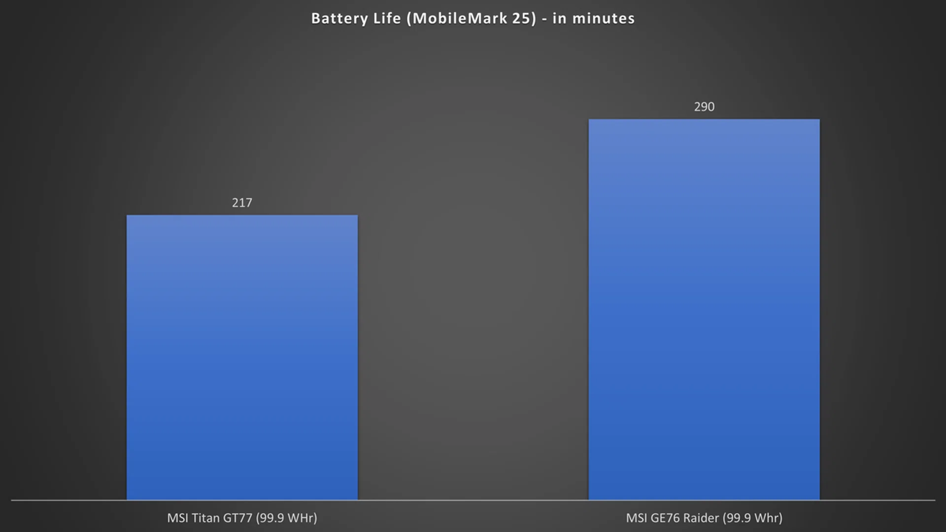It’s not surprising to see the Titan GT77 having a poorer battery life performance compared to the GE76 Raider, despite having a similar battery capacity. Not only is the Core i9-12900HX a more power-hungry processor with a higher maximum turbo power draw of 157W than the i9-12900HK’s 115W, but the Titan GT77 also has a wee bit more powerful components that have to be taken into consideration too – such as the 4x 1TB solid-state drives (the GE76 has two SSDs).