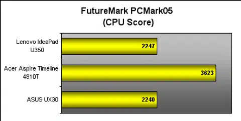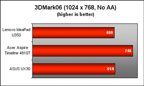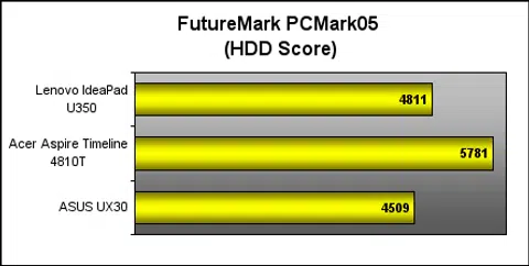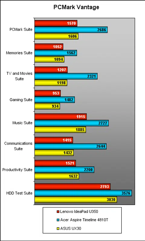 Loading up our three usual suspects: PCMark05, PCMark Vantage and 3DMark06, we put the Lenovo IdeaPad U350 to the test. Matched against a similarly specced ASUS UX30, the Lenovo unit was found to on par against the ASUS unit. Against the Acer Aspire Timeline 4810T which featured much better specifications however, the differences in the performance benchmarks become very obvious. Generally speaking though, the performance of the review unit of the U350 does feel like it's holding up its end of the deal with regards to its endowed hardware specifications, so no worries there.