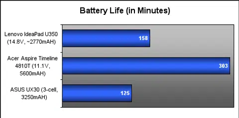In battery life uptime testing, the Lenovo IdeaPad U350 does slightly better than the ASUS UX30 here, with a running life of 158 minutes, or just over 2.5 hours. This still pales in comparison to the Acer Timeline, but the Acer unit does pack a heavier battery compared to the 4-cell of the U350.