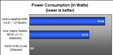 Power consumption wise, the unit does lag behind the Acer model too with a higher power draw at 15.59W. While it's still a low figure inline with other ultraportables, we were hoping for power consumption figures lower than the Acer unit. All the more since the processor used is a single-core unit and not even a dual-core processor used on the Acer Timeline. So raking specs and battery life uptime, we think the Lenovo IdeaPad U350 is a bit poor on the power optimization.