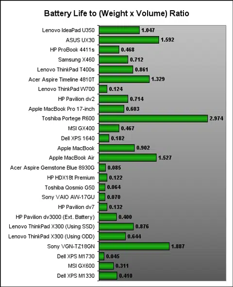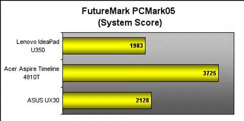 On the portability front, after churning our formula pitting battery uptime figures against the weight and volume of each notebook, the Lenovo IdeaPad U350 does fare decently with a ratio of 1.047. Still, it's not as good as the ASUS or Acer machines as both scored a much higher ratio compared to the U350. It looks like power optimization is poor on the U350 even despite its sexy figure. Let's see what the benchmark numbers reveal before we draw our conclusions of the notebook in general.