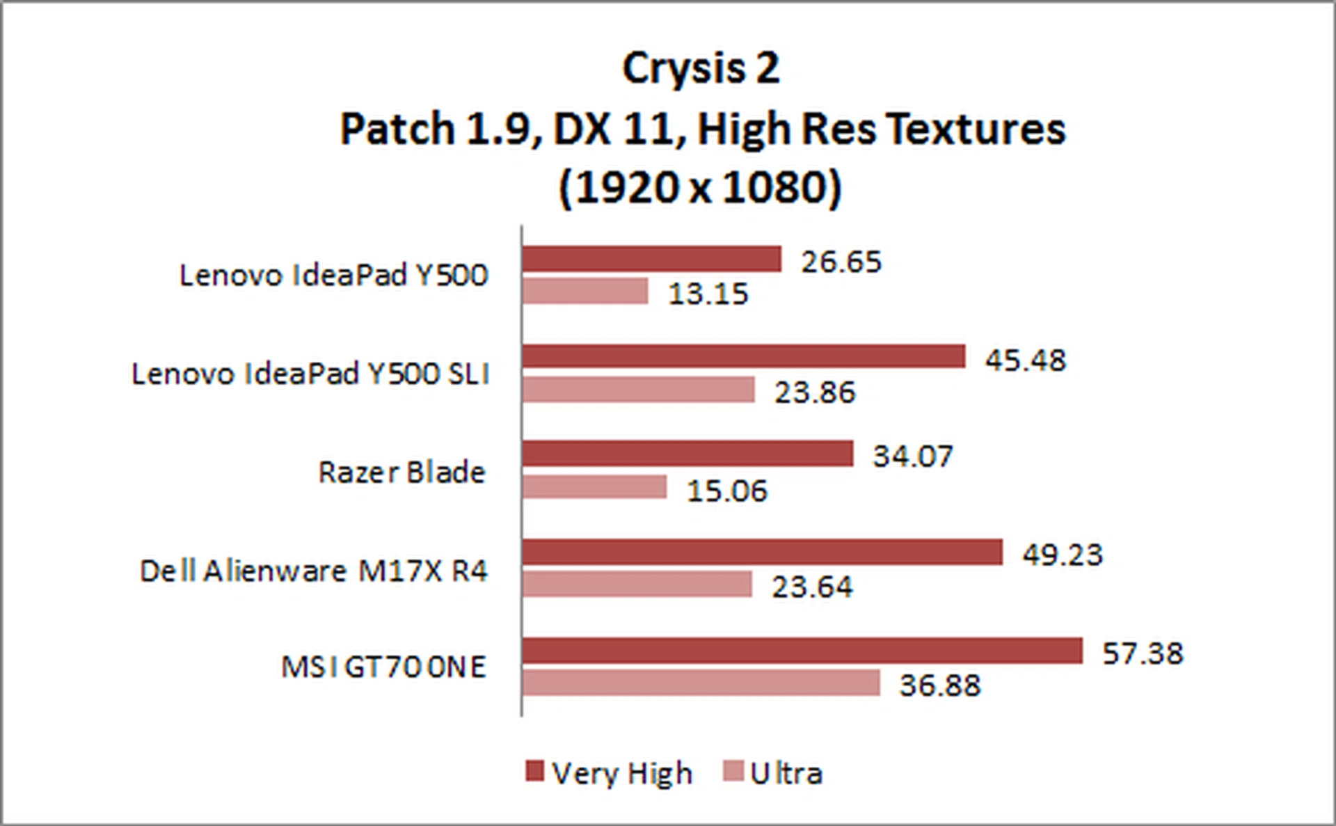 The very intensive Crysis 2 benchmark consists of a grueling test of tessellation, Parallax Occlusion Mapping, water rendering, and particle motion blur and shadowing. Despite this, the Y500 SLI config still managed to perform well, continuing to outscore the Razer Blade, with output equal to the Alienware M17X R4.