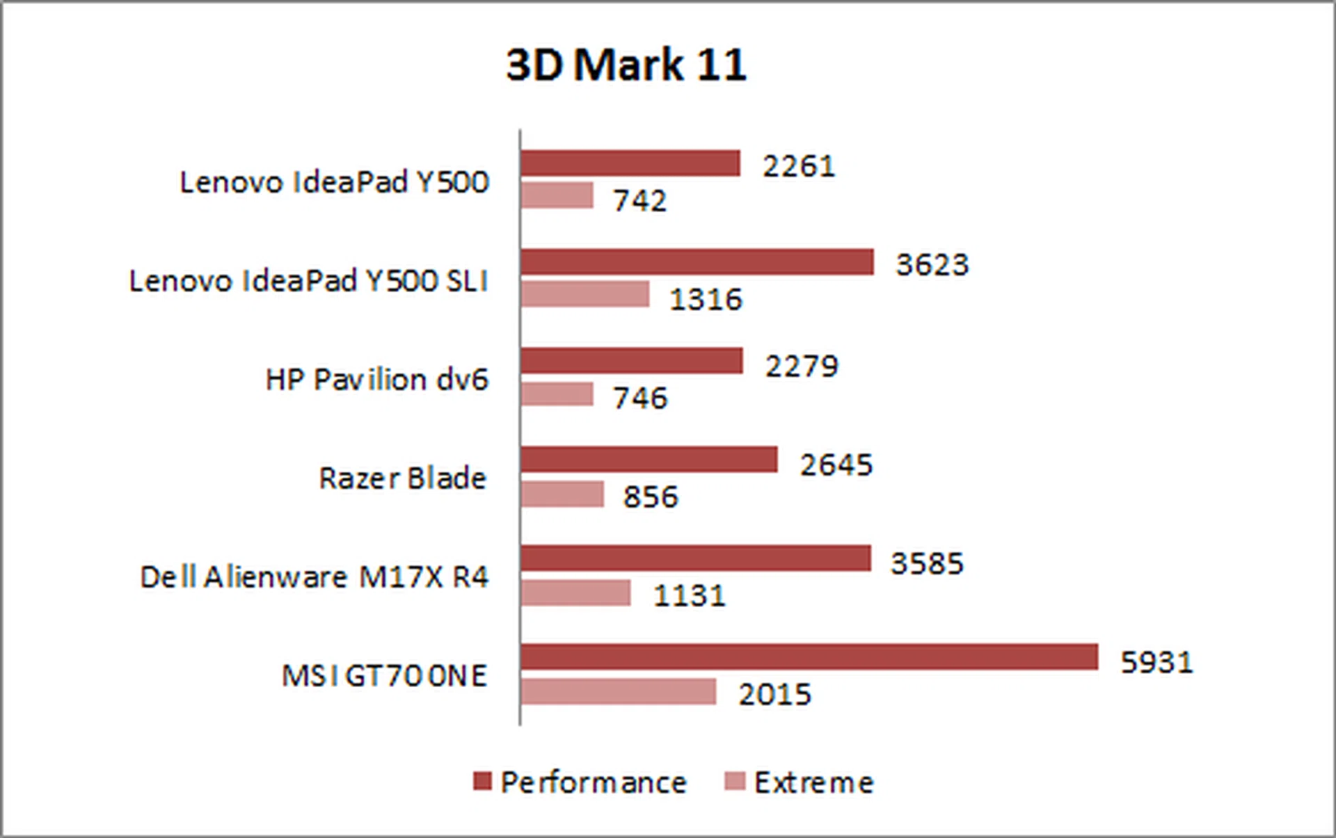 3DMark 11 is a synthetic benchmark designed to test a notebook's GPU performance at various aspects of DirectX 11 such as tessellation and DirectCompute. With the single GPU configuration, the Lenovo Y500 scored very similarly to HP's Pavilion DV6, and slightly behind the Razer Blade. However, when we tested the SLI setup, it almost doubled its score, matching and actually slightly surpassing Dell's monster Alienware M17X R4 machine!