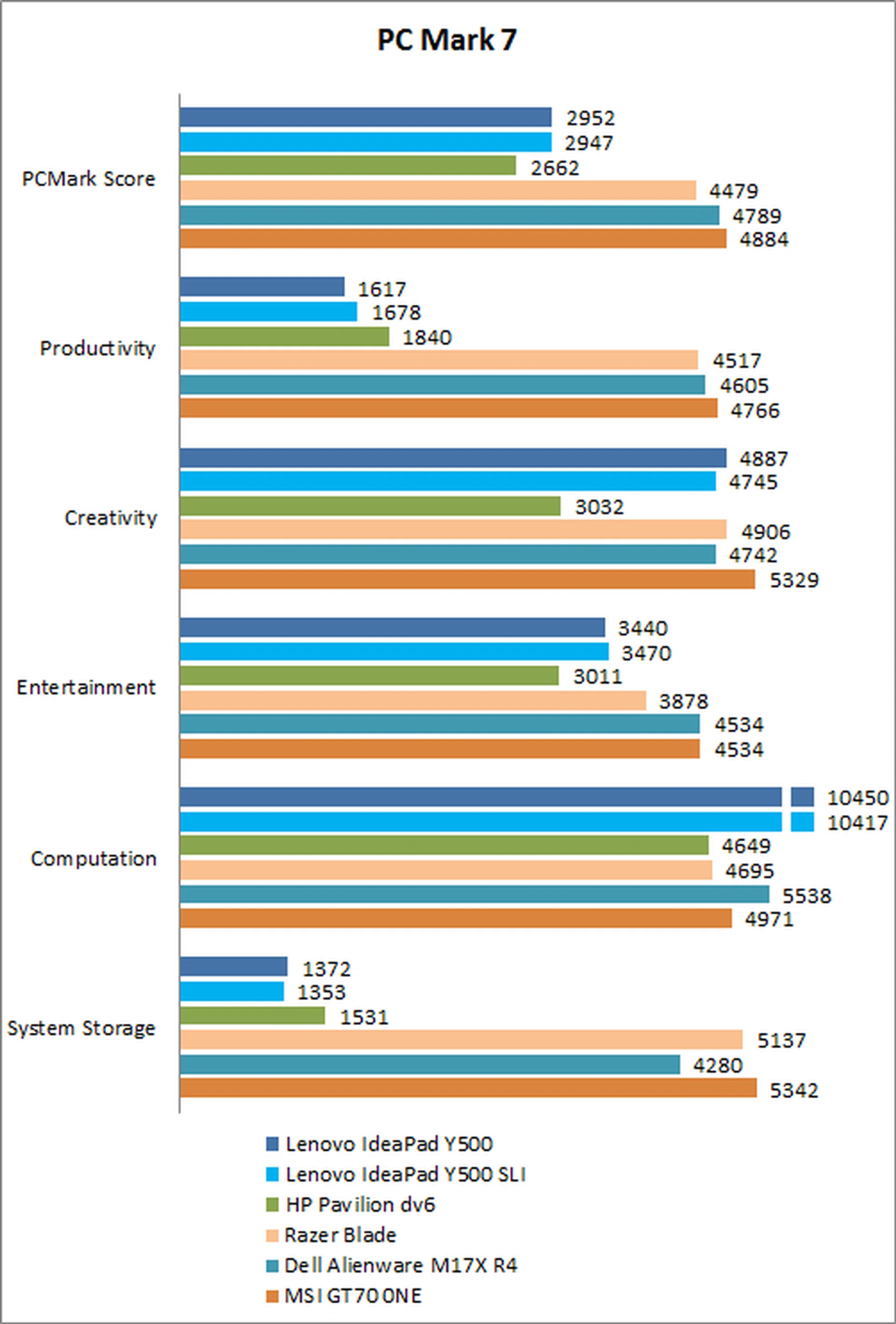 PCMark 7 tests a machine's overall capabilities. The SLI setup didn't seem to make a difference in this benchmark, with both results almost identical. The Y500's biggest downfall was its System Storage score, where it was let down by its mediocre 5400 RPM HDD.