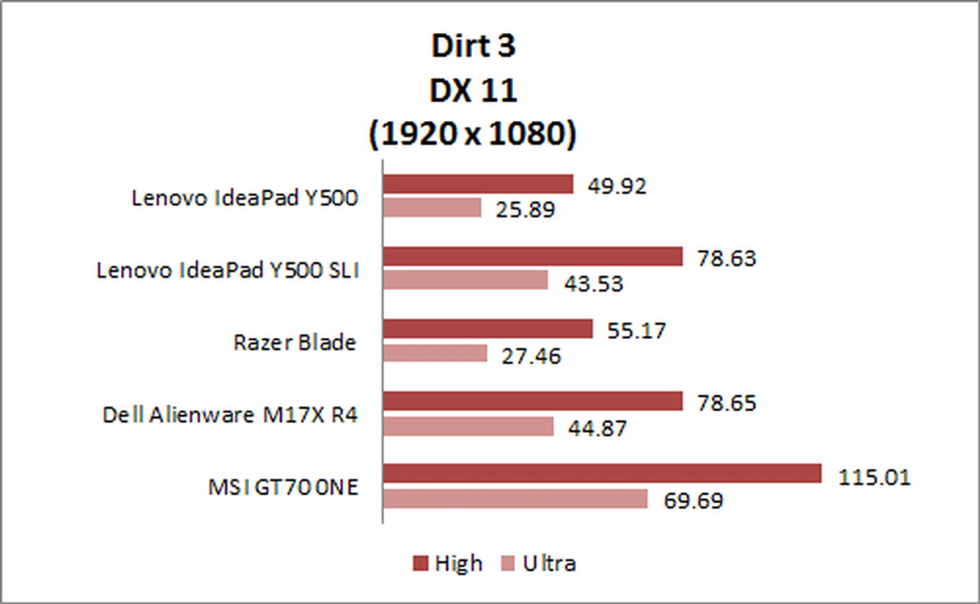 Dirt 3 showed the same result, with the Y500 SLI almost doubling the performance output of the single GPU default configuration, and matching the performance of the Alienware M17X R4.