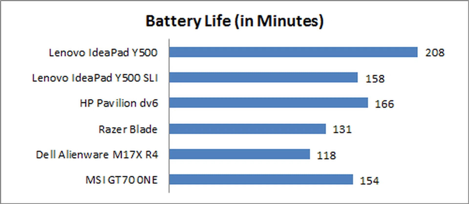 With the optical drive installed, the Y500 managed to last a very impressive 3 hours and 28 minutes, far surpassing the rest of our machines. Surprisingly, even when not in use, the second GPU module made a huge difference in battery life, knocking 50 minutes off of the Y500's total battery life.