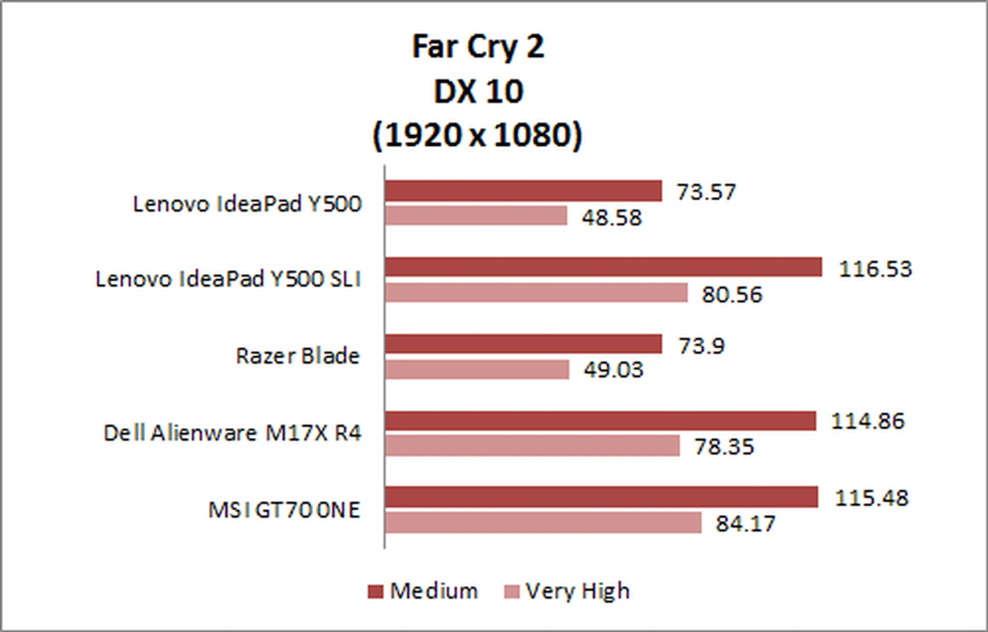 We saw a similar result in Far Cry 2 with the Y500 SLI config easily outscoring the Razer Blade and matching the Alienware M17X R4.