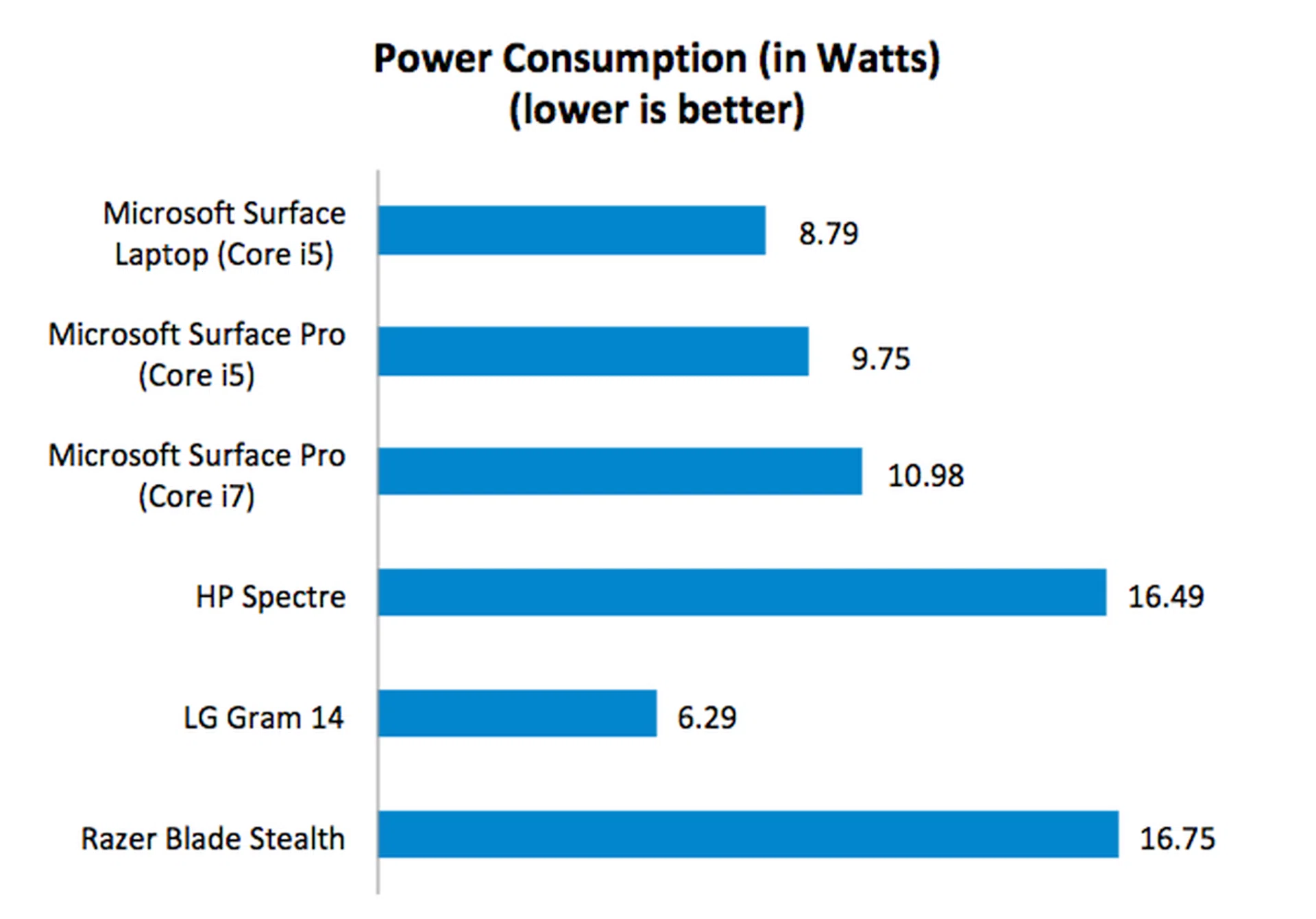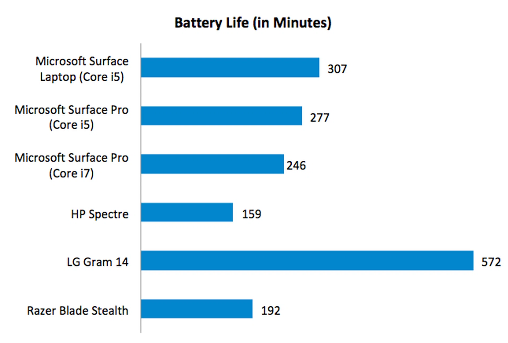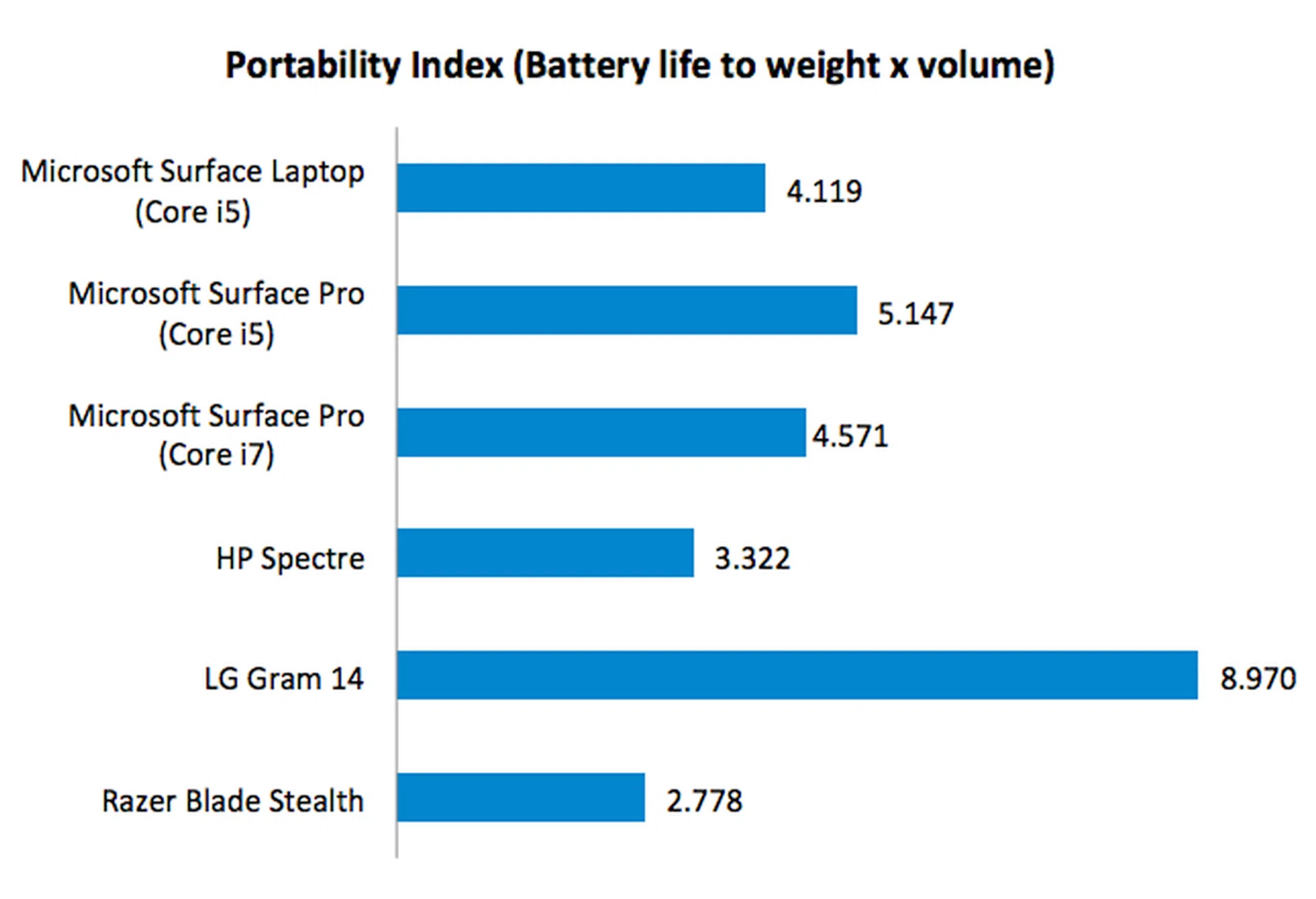 So if we were to apply our Portability Index to its battery life result, we would end up with a portability score of 4.119. It's no match for the amazing LG gram 14, which happens to weigh just 980g and has a battery life of an incredible 9.5 hours. But, the Surface Laptop is still one of the most portable notebooks we have tested. So yes, the Surface Laptop is a very portable notebook considering how most other notebooks fare.