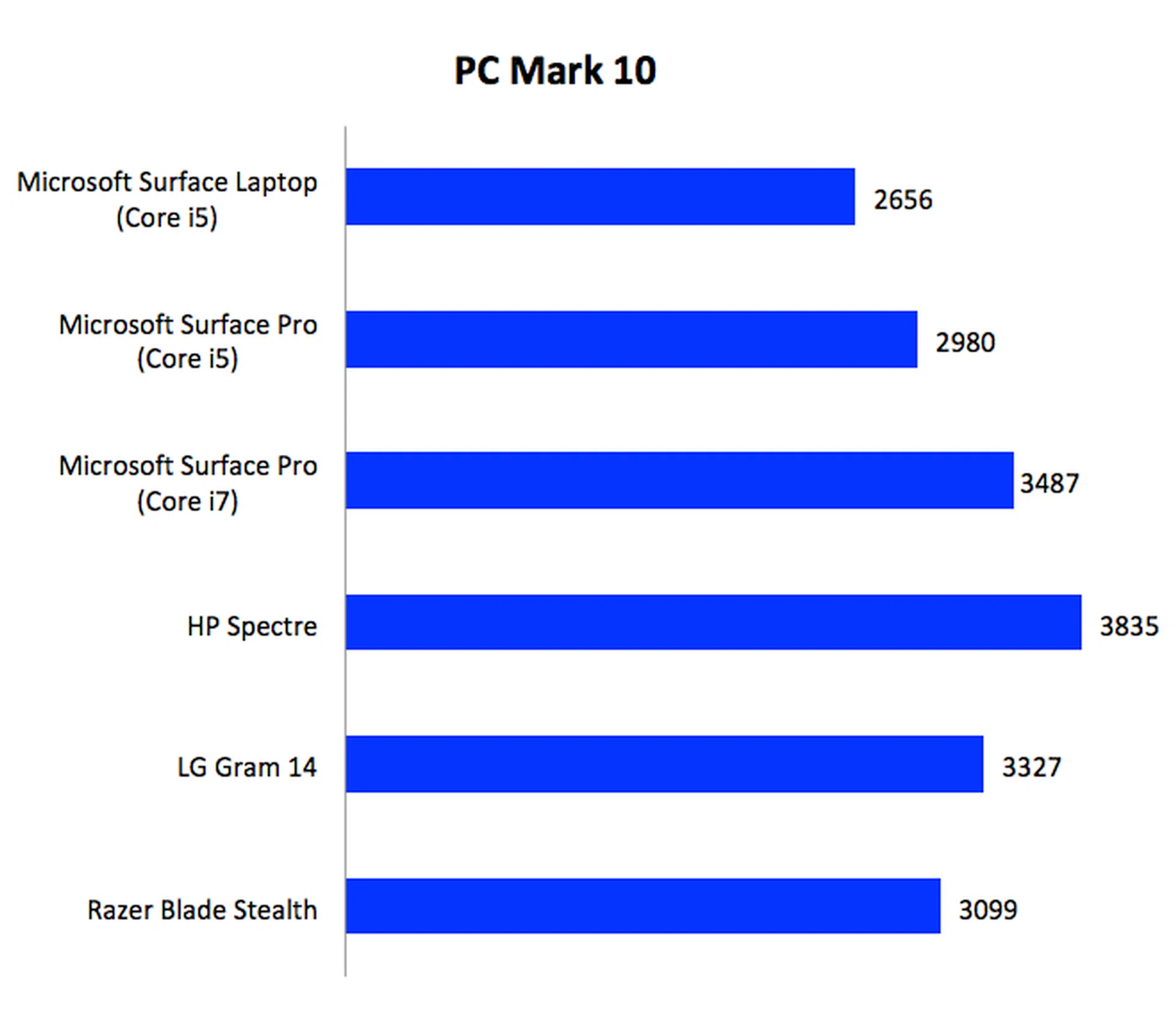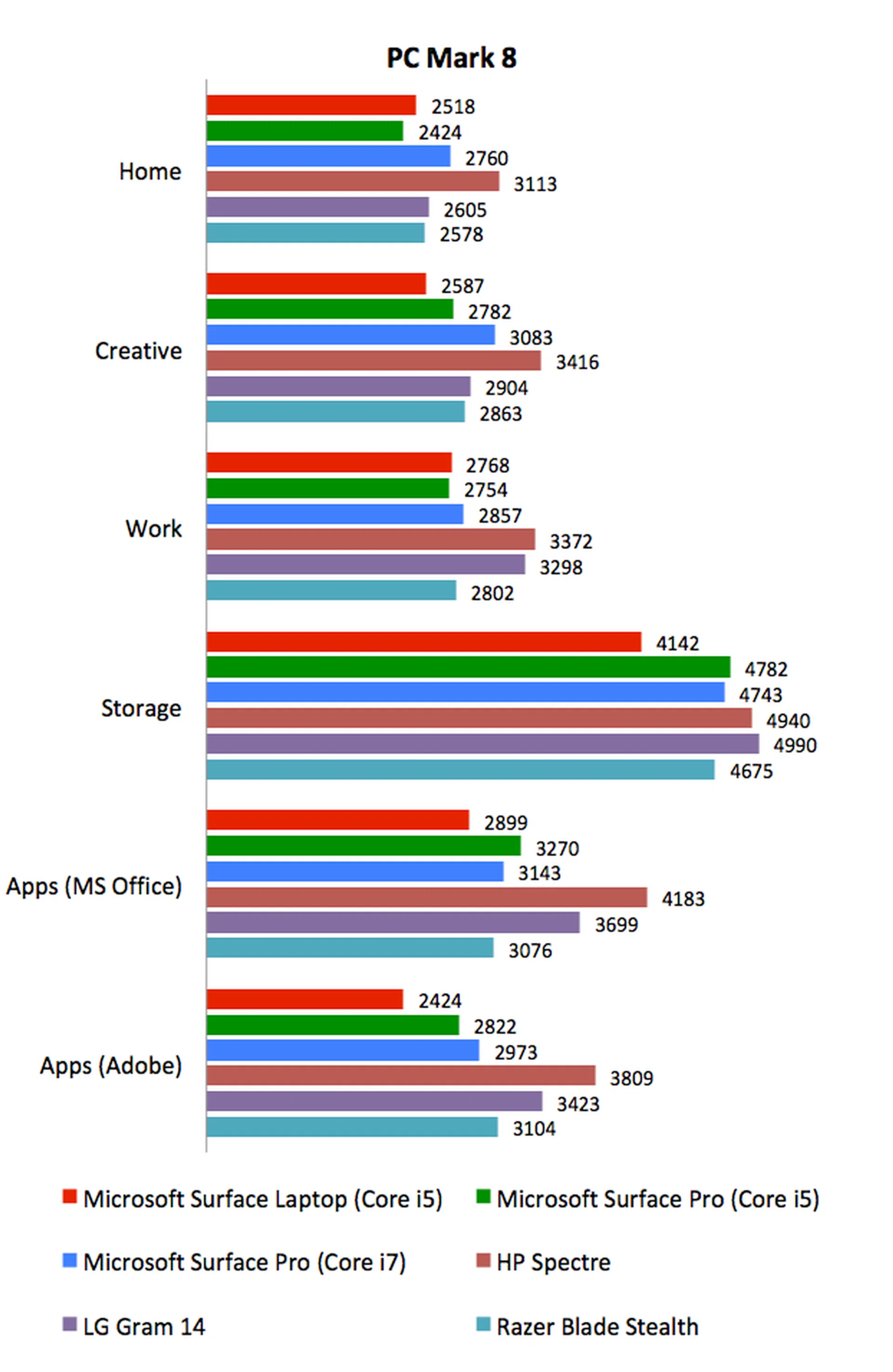 The Surface Laptop we tested is the mid-range model with a Core i5-7200U processor, 8GB of RAM, and a 256GB SSD. Overall performance is quite decent and mostly matches our expectations of a notebook with a Core i5 processor.
