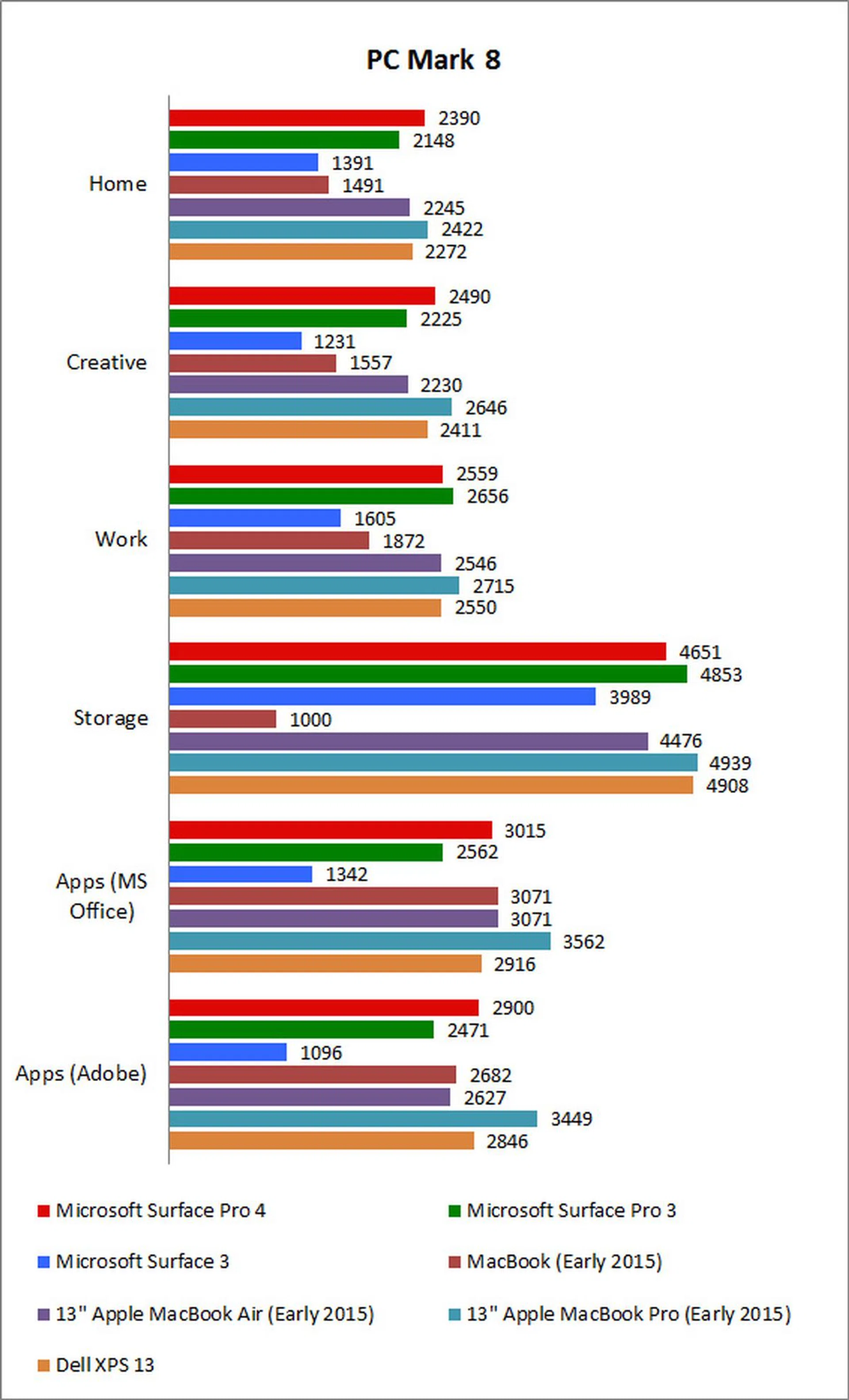The Surface Pro 4 actually stood its ground quite well in PCMark 8, posting scores that were within the top three for all but one of the benchmark suites, the exception being the Storage test. In the general Home benchmark which assesses performance in applications that a casual user is most likely to engage in, for instance Web browsing, writing, and video conferencing, the Surface Pro 4 turned out to be around 11% faster than the Surface Pro 3.