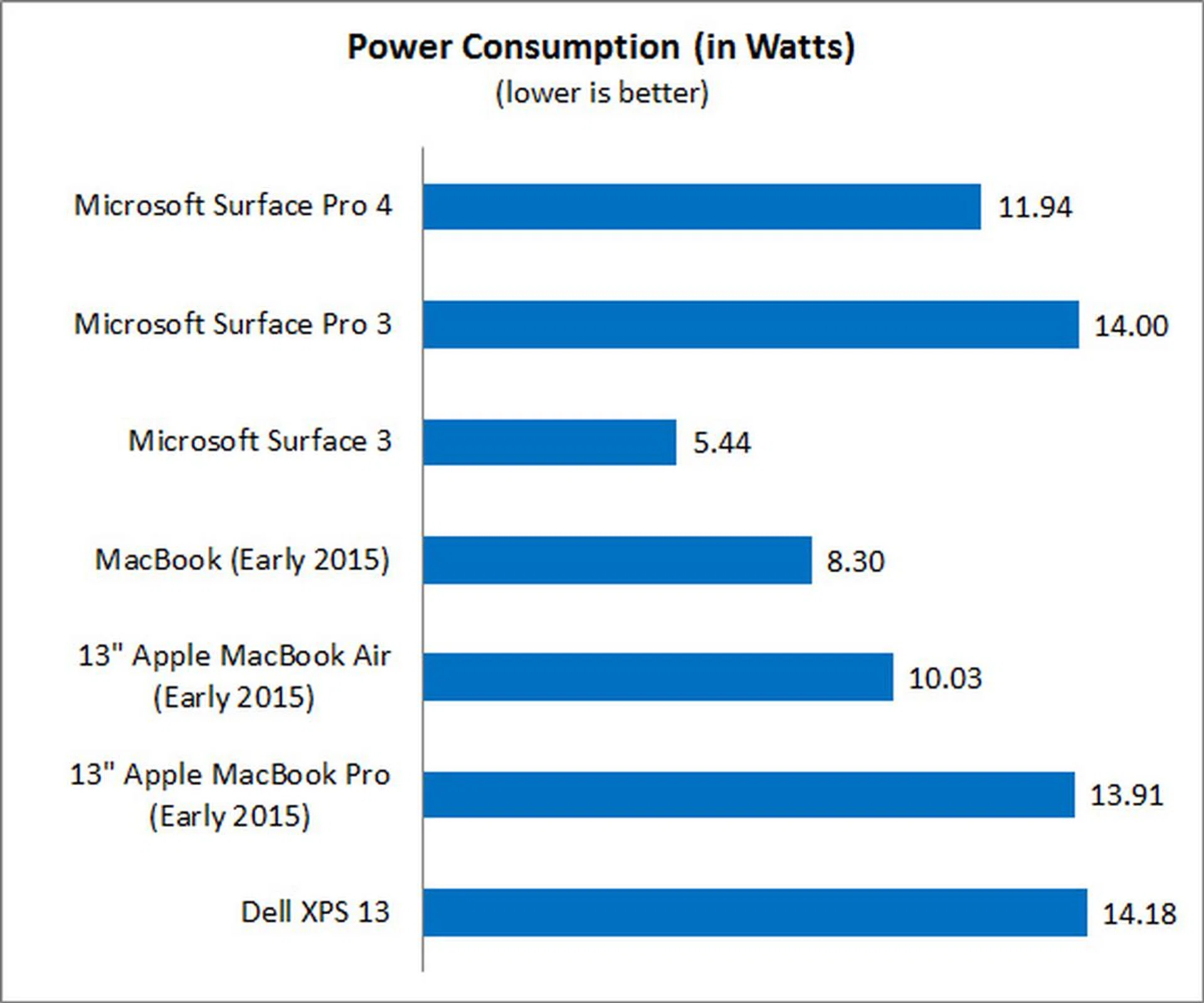 Our power consumption figures go on to show that the Intel Core i5-6300U is just that much more efficient than the Core i5-4300U on the Surface Pro 3. It’s still not up to the power-sipping Atom processor on the Surface 3 of course, but it does compare fairly favorably with the other ultrabooks.