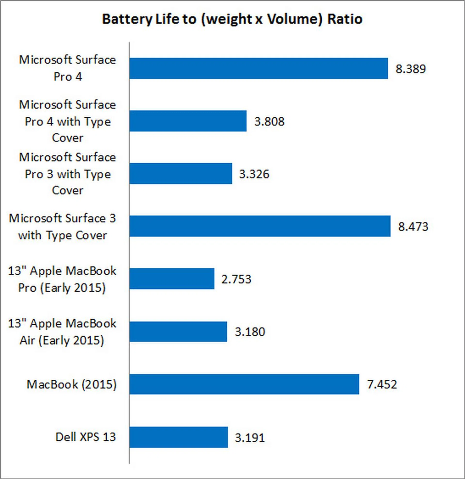 Our portability index takes into account battery life, weight, and volume to provide a measure of how easy a notebook is to carry around relative to other compared systems. The higher the figure, the better, and the Surface Pro 4 came ahead of the Surface Pro 3 (both with Type Cover keyboard installed), which is unsurprising given its stronger performance in our battery tests and thinner profile.