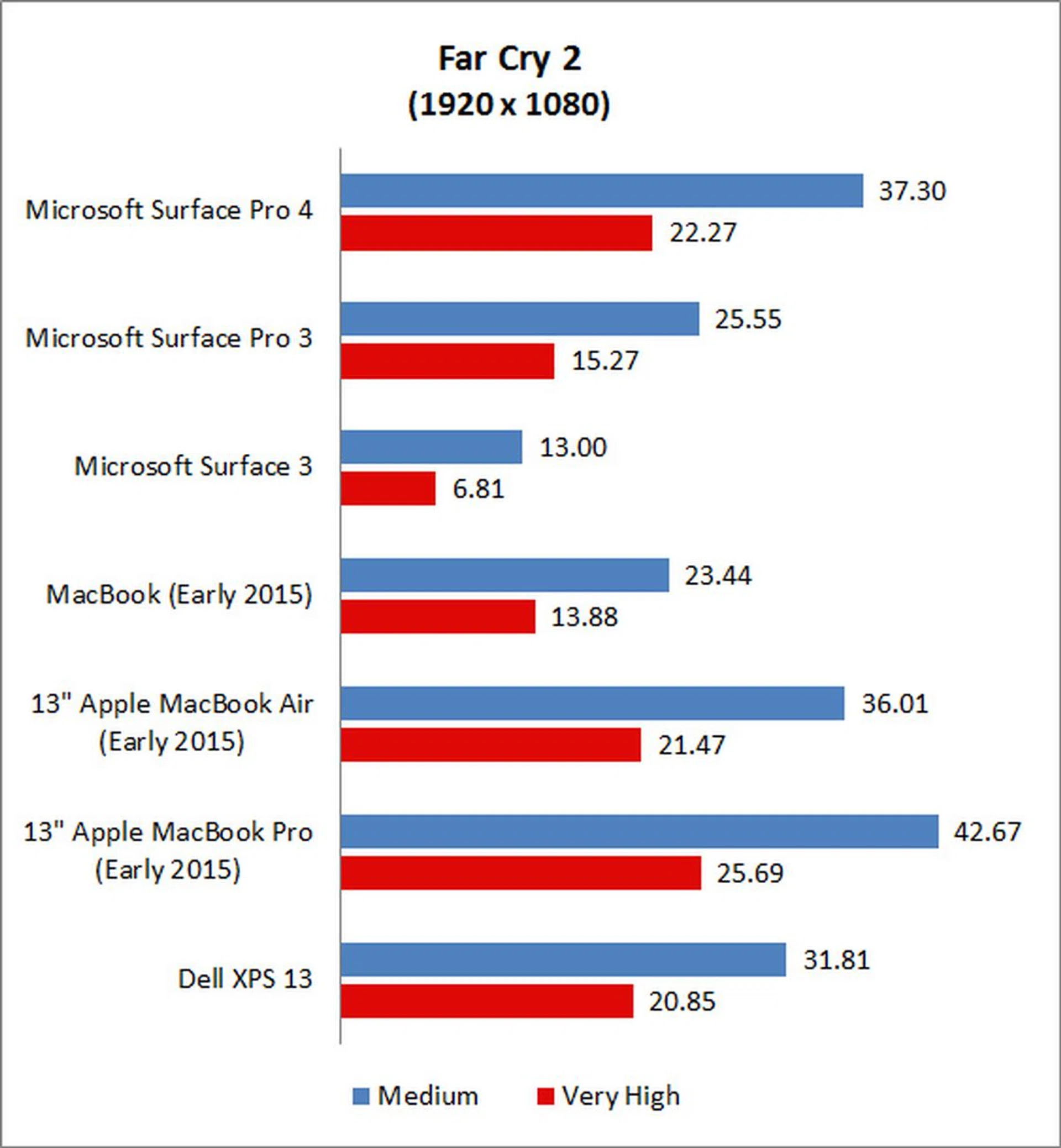 In Far Cry 2, the Surface Pro 4 posted a respectable average of 37.30fps at medium settings and a 1080p resolution. That’s definitely playable, but most games today aren’t as easy to run as Far Cry 2. At high settings, things were still playable at 22.27fps, around a 46% improvement over the Surface Pro 3’s barely playable 15.27fps.