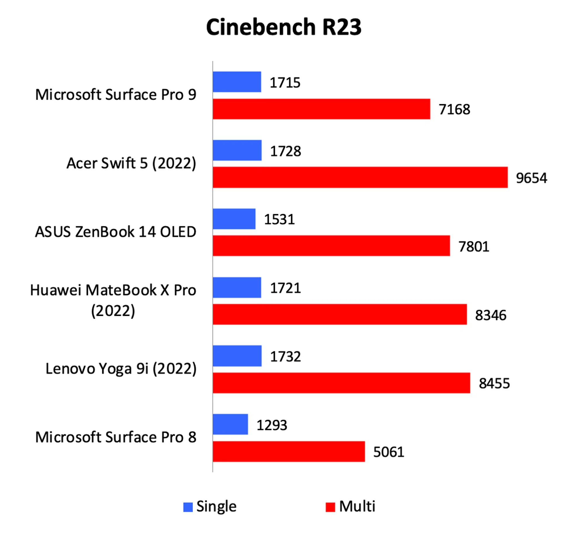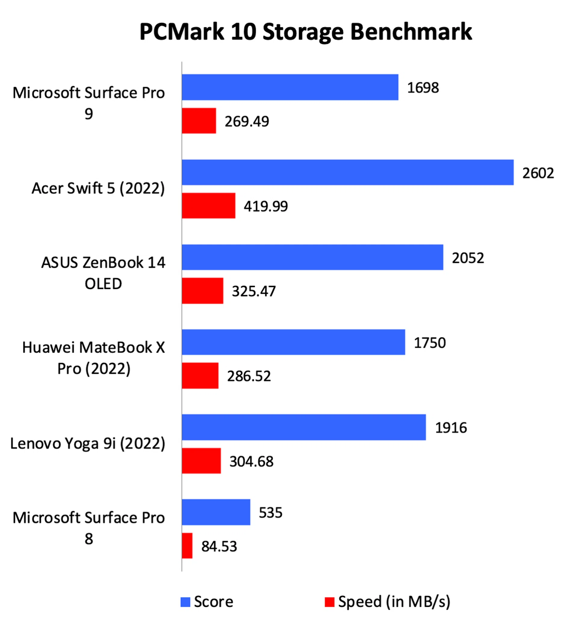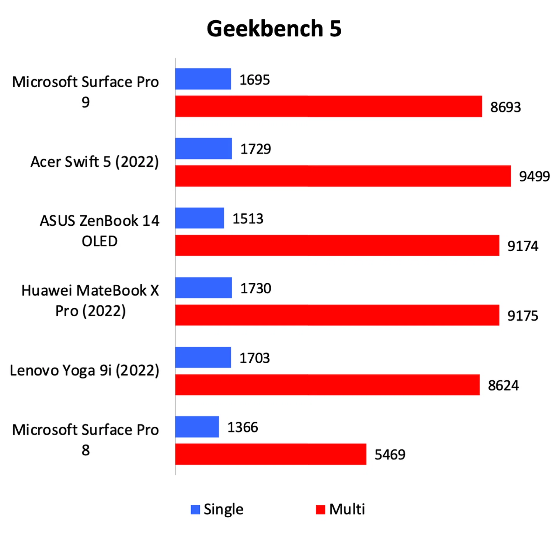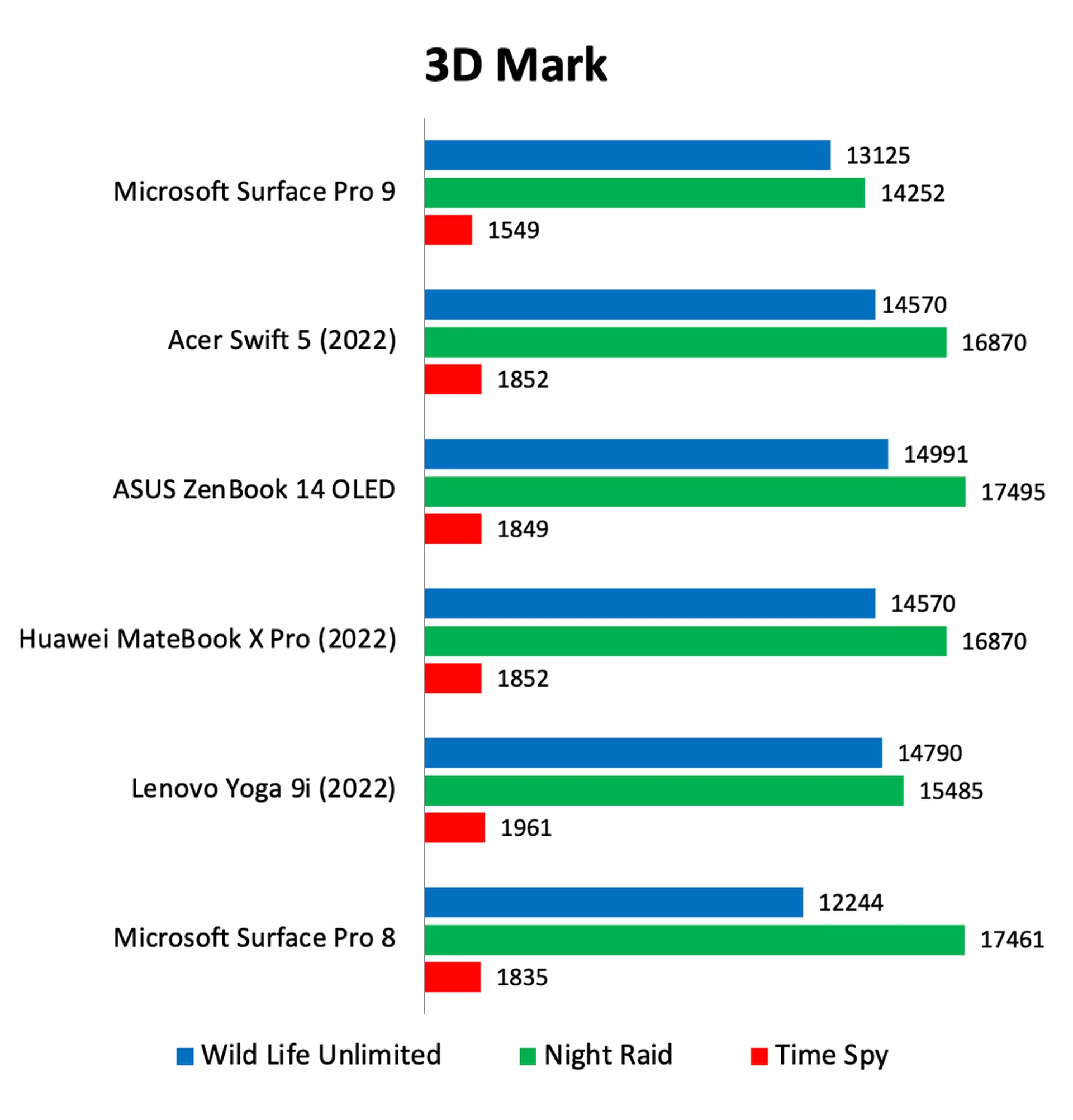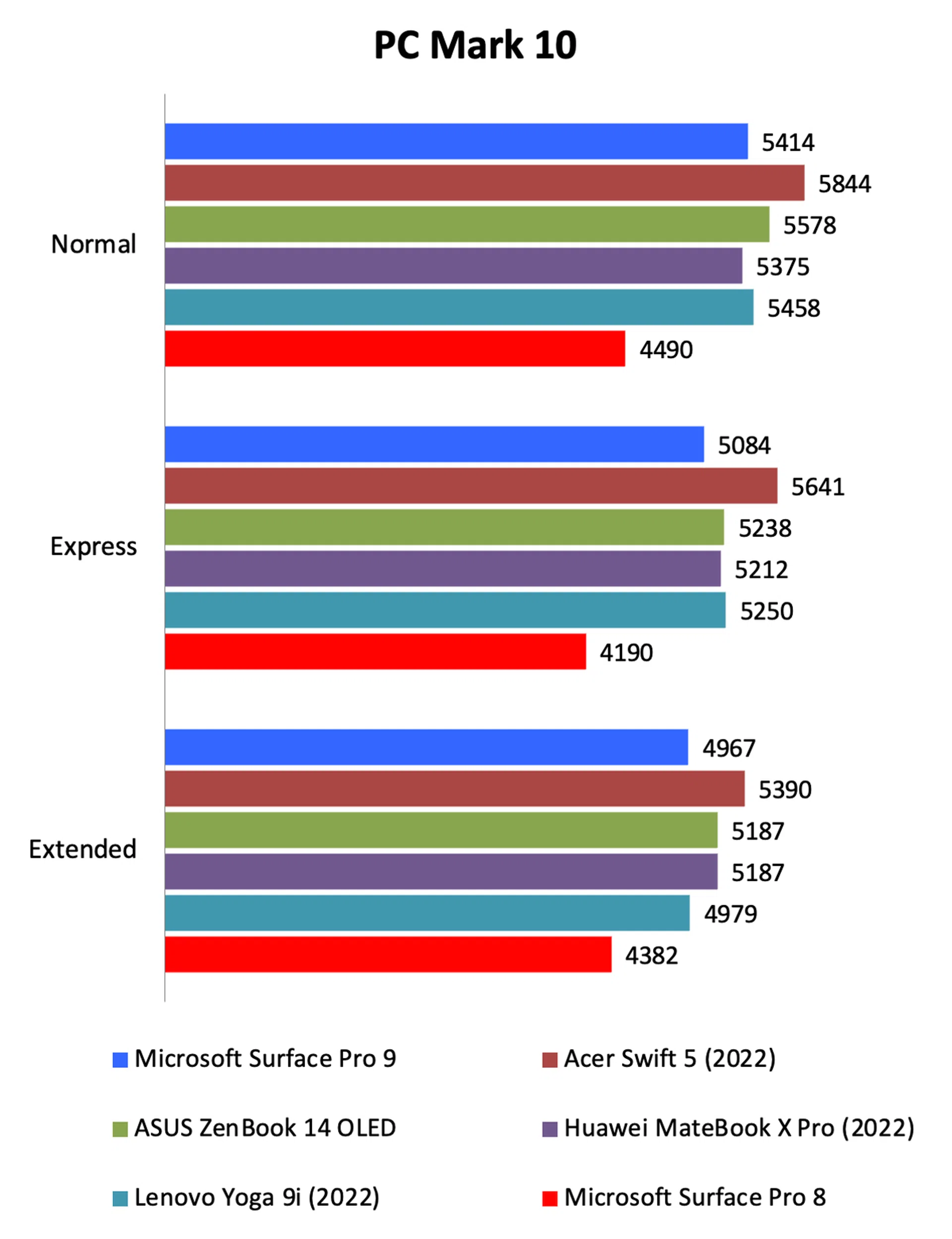 Despite having a less powerful U-series processor, the Surface Pro 9 managed results that were almost on a par with ultraportable notebooks that have more powerful P-series processors. Looking at the results from Geekbench and Cinebench, we can see that single-core performance was nearly as good as any notebook with a P-series processor and it is only in multi-core performance that it starts to lag, and even then, the difference isn’t all that great. Graphics performance wasn’t too shabby either, though it must be said that this isn’t a gaming machine at all. If you do want to play games, be prepared to dial back the graphics settings significantly.