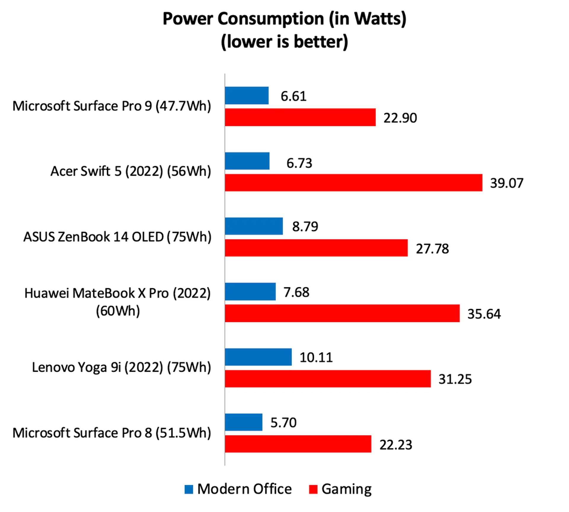 One interesting thing about the Surface Pro 9 is that despite having the same physical dimensions as its predecessor, it actually has a smaller battery capacity – 47.7Wh vs. 51.5Wh. It doesn’t sound like much, but it’s actually a 7.3% reduction in battery capacity. This, coupled with the fact that Intel’s new processor doesn’t seem to be any more power efficient (as evidenced by the power consumption figures), means a significant drop in battery life. Whereas the Surface Pro 8 could manage over 9 hours in our battery life test, the new Surface Pro 9 checks itself out at a little over 7 hours. It’s decent for a device of its size and weight, but there’s no denying that it’s also a lot less than what its predecessor could manage.