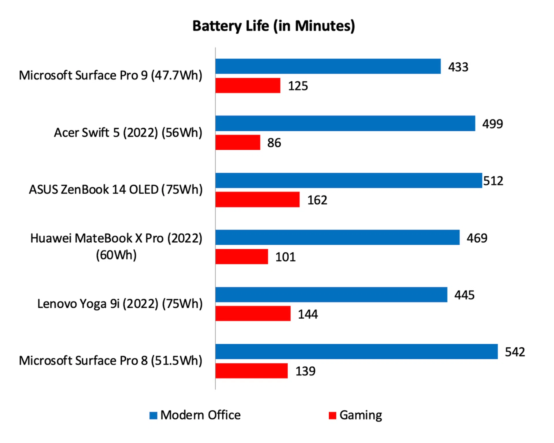 Note: Battery tests were conducted using PCMark 10's battery benchmark with the display set to 100% brightness.