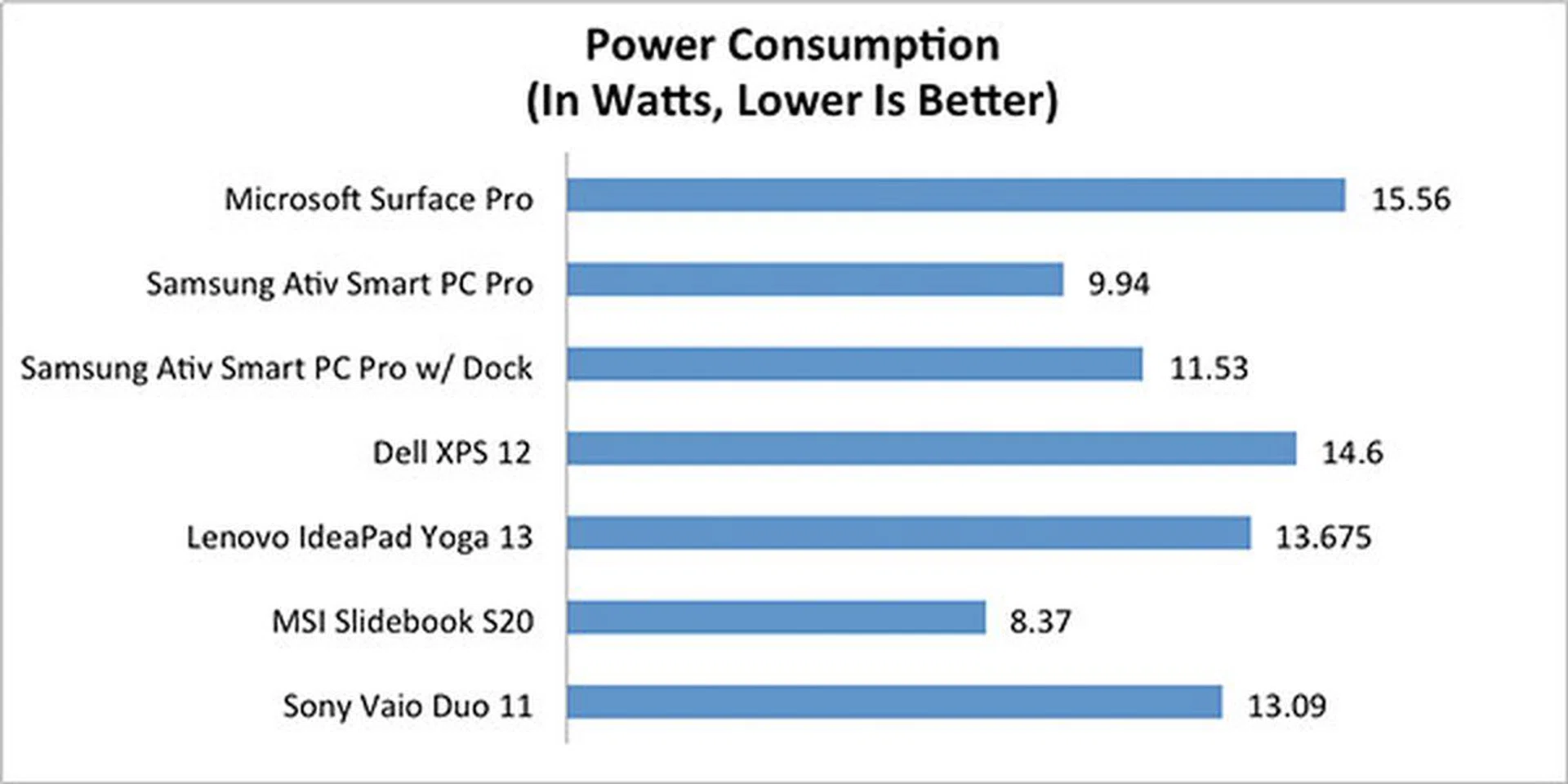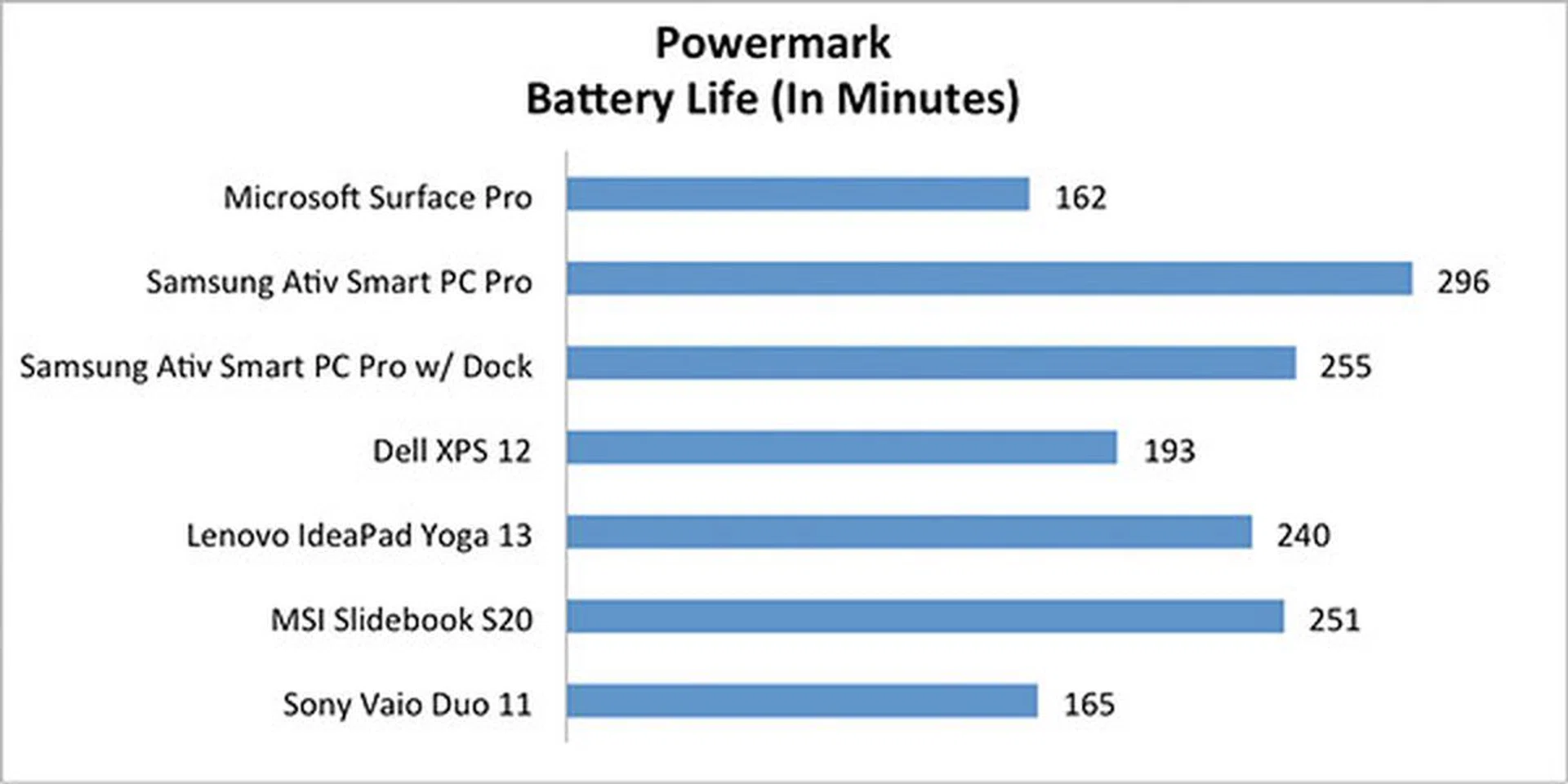 Using Powermark's balanced test suite that does an even split between Internet browsing, word processing, video, and gaming workloads, the Surface Pro's battery lasted only 2 hours and 42 minutes. That's easily two hours shorter than what the dock-less Samsung Smart PC Pro achieved. Even with the dock (that draws power for its two USB ports, keyboard, trackpad, and status LEDs), the Smart PC Pro still lasted longer than the cover-less Surface Pro. (According to our tests, neither the Touch nor Type Cover has any meaningful impact on battery life.) It's truly a catch-22 situation here: should you go for the Surface Pro with its better system performance, or the Smart PC Pro with its very much better battery life? If you're always on the move, with no easy access to a power point, the answer is clear. For another data point, the Surface Pro's battery life is very similar to that of the Sony Vaio Duo 11, but the latter we're comparing against runs a Core i7 CPU and has a slightly bigger screen.