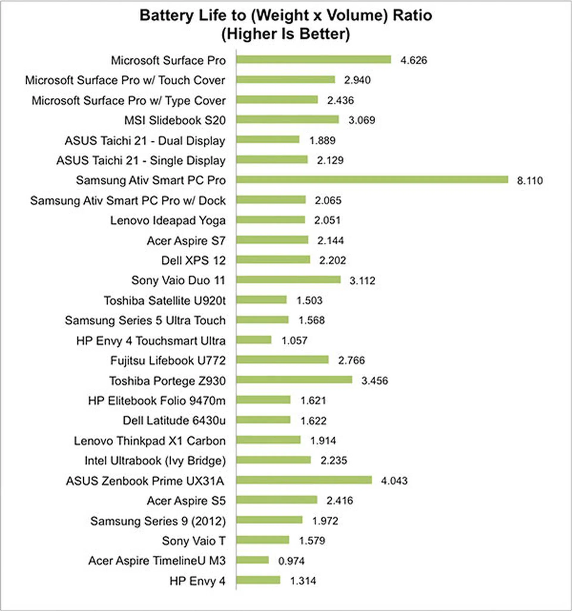 On a side note, the sliding form-factor Ultrabooks like the MSI Slidebok S20 and the Sony Vaio Duo 11 both have a portability index that sits in between the Surface Pro and the most typical Ultrabooks. Given their versatility, it's good too see them fare just as they are intended and are great options for those who need one complete device that can handle a variety of situations. They will also likely appeal to those who can't make up their mind as to what form factor is a safe option.