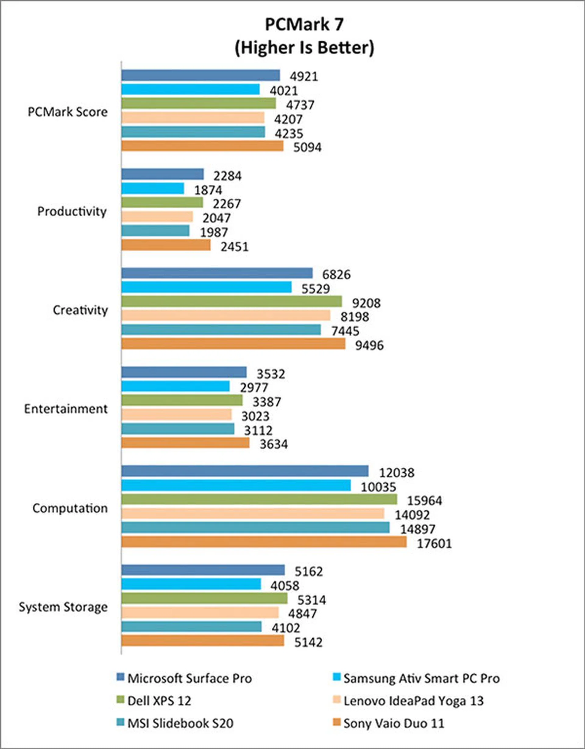 Futuremark's PCMark 7 is a popular benchmarking tool for testing all aspects of a PC, from storage and computation, to image and video manipulation, Internet browsing, and gaming. The Surface Pro managed a chart-topping score of 4,921, some 900 points higher than the Samsung Smart PC Pro. In truth though, we hardly noticed any sluggishness during real world use for the latter. Unsurprisingly, Microsoft's tablet also fared well against the other Core i5-equipped convertible Ultrabooks. It even came close to the Core i7-equipped Sony Vaio Duo 11.