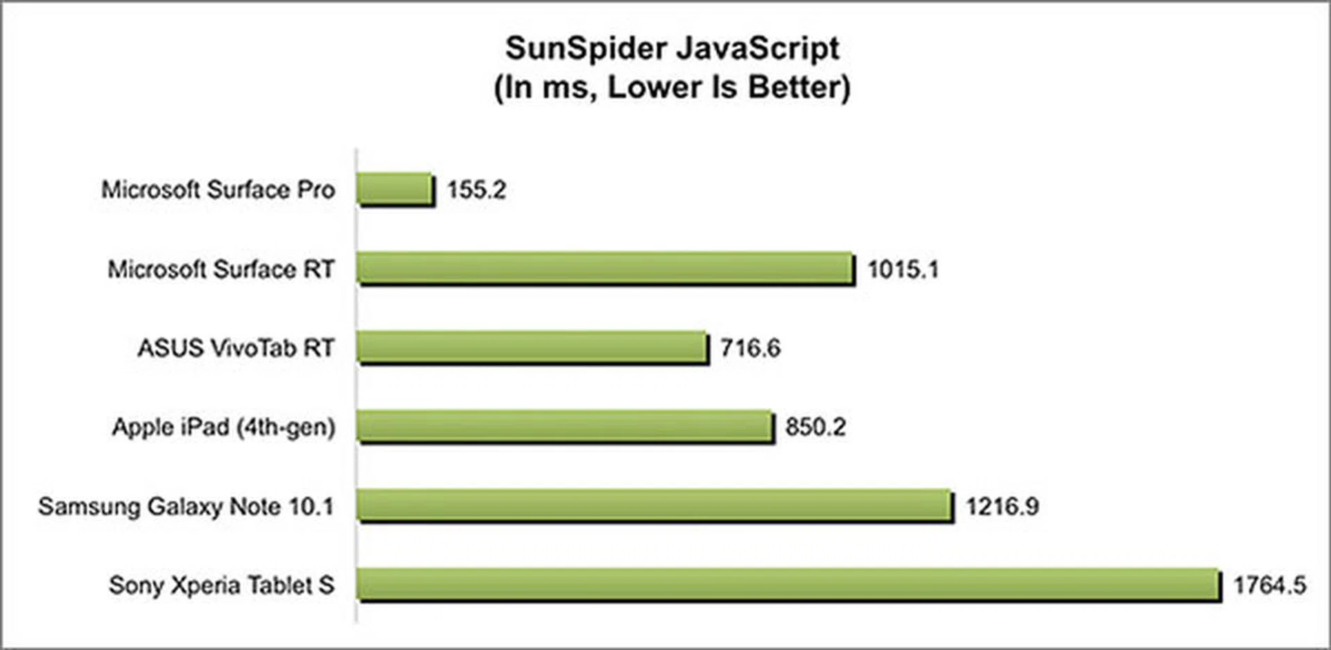 'No compromise' is the buzz phrase that Microsoft has been using for Windows 8. Designed for both touch and keyboard/mouse use, it enables all sorts of hardware form factors. In Microsoft's own words, the Surface Pro is 'a powerful PC in tablet form'. We already know that it possesses superior horsepower compared to ARM-based tablets, but does that matter to browser performance? For that, we turn to SunSpider, a web-based benchmark that tests the core JavaScript language. For this test, we pitted the Surface Pro against several ARM-based tablets; each device's stock browser was used.