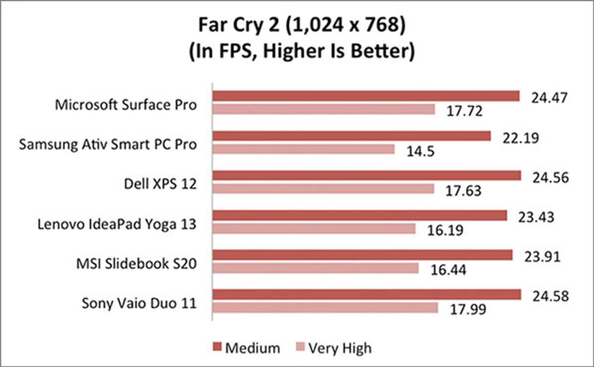 For another point of reference, we used Far Cry 2, a DirectX 10 title, as a framerate benchmark; this time, running at a more sane resolution of 1,024 x 768. Our conclusion that the Surface Pro is a decent casual gaming system (like most Ultrabooks) remains.