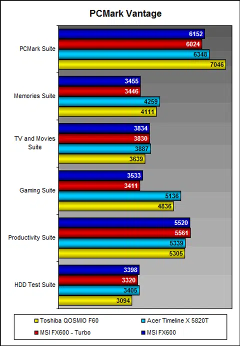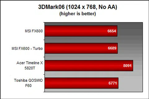 Between the three notebooks using an Intel i5-processor, the MSI FX600 scores the lowest, even when using their included Turbo Drive mode. Turbo Drive doesn't seem to be doing much for the notebook; in fact, it seems to have lowered the scores! Then again, while the performance is the lowest of the compared notebooks, it's not off by much.