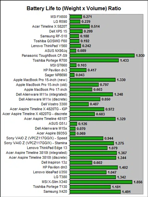 With a ratio of 0.271 though, the notebook shows that while it's not quite as portable as the Acer notebook, it easily equals or beats many of the other notebooks of the same category. Not too shabby, we think, but there's room for improvement given the notebook's specs.