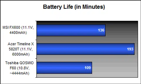 Packing an NVIDIA GeForce GT 325M means the MSI FX600 should deliver pretty average performance in the 3D graphics department, and while the scores show that even in Turbo Drive mode, the FX600 scored the lowest among the notebooks mentioned here. Note that Turbo Drive didn't really give the unit any boost in the 3D performance area, so you may be better off leaving it off to save on power consumption.