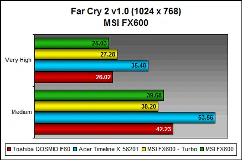 With not so impressive results from the 3DMark06 test, we expect pretty middling performance, but the game should still be playable at medium settings. As can be seen from our performance graphs, the FX600 still retains the lowest score. While the notebook does have a full HD (1920 x 1080 pixels) screen, chances are you won't be playing games at that resolution. Rather, the high resolution screen is more handy for watching movies.