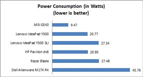 The MSI GE40 has a decently-sized 65Wh battery pack and we found that it could run nearly 7 hours, which is impressive, far exceeding any of the other gaming notebooks here. Calculating its power consumption, we arrived at a very low figure of just 9.47 watts, which is just half that of its competitors. Based on this, it seems that Intel has delivered on its promises and claims. The new fourth generation Core processors are truly its most power efficient yet!