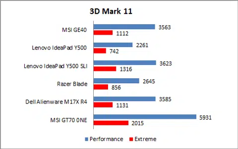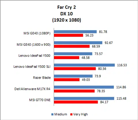 Moving on to real-world gaming benchmarks, the MSI GE40 did reasonably well as it saw off the Lenovo IdeaPad Y500 and Razer Blade (2012). However, it was no match for the Lenovo IdeaPad Y500 when in SLI mode and also the Dell Alienware M17X R4 and MSI GT70 0NE.