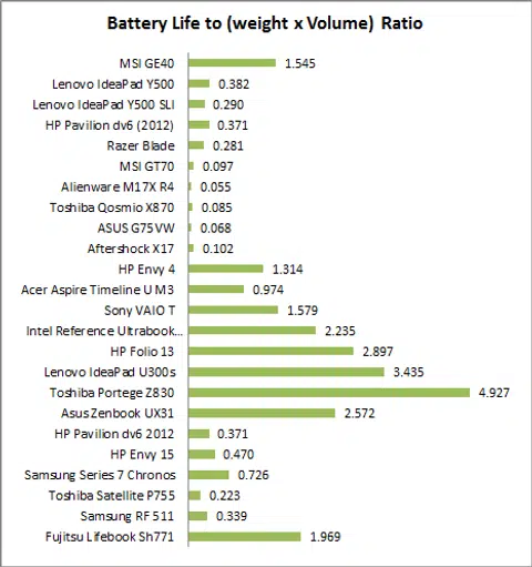 Our Portability Index factors in battery life, weight and volume so you can see which notebook is the most worthwhile to carry around. As you can clearly see, its portability index score far exceeds that of any gaming-class notebook and is a rival for Ultrabooks.