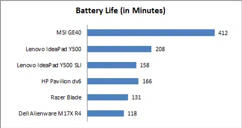 Usually, we use Powermark to determine the battery life of a notebook system, but for unknown reasons, Powermark refused to run on the MSI GE40. As a result, we had to fall back on our previous testing methodology, in which we looped a high-definition video clip over and over until the notebook ran out of juice. From our extensive testing experience, we've found found that both testing methods will net somewhat comparable results.