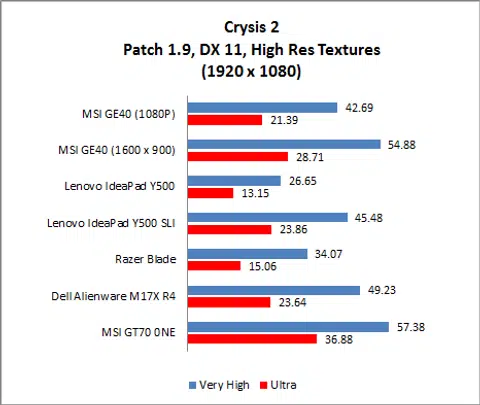The MSI GE40 ran Crysis 2 comfortably even in full HD and stuttered only when we upped the settings to "Ultra". Although its performance was about on a par with the Lenovo IdeaPad Y500 in SLI mode, we found that it recorded lower frame rates than both the Dell Alienware M17X R4 and MSI GT70 0NE.