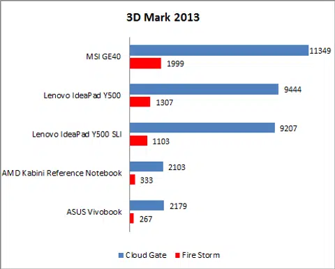Unsurprisingly, the MSI GE40 easily trumped the Lenovo IdeaPad Y500, thanks to its superior discrete graphics chip. Note that results of IdeaPad Y500 in SLI mode was low because of some incompatibility with the benchmark. Finally, we can also see the gulf in performance between discrete graphics such as the MSI GE40’s GeForce GTX 760M and integrated graphics such as those found on our AMD Kabini reference notebook and the ASUS Vivobook.