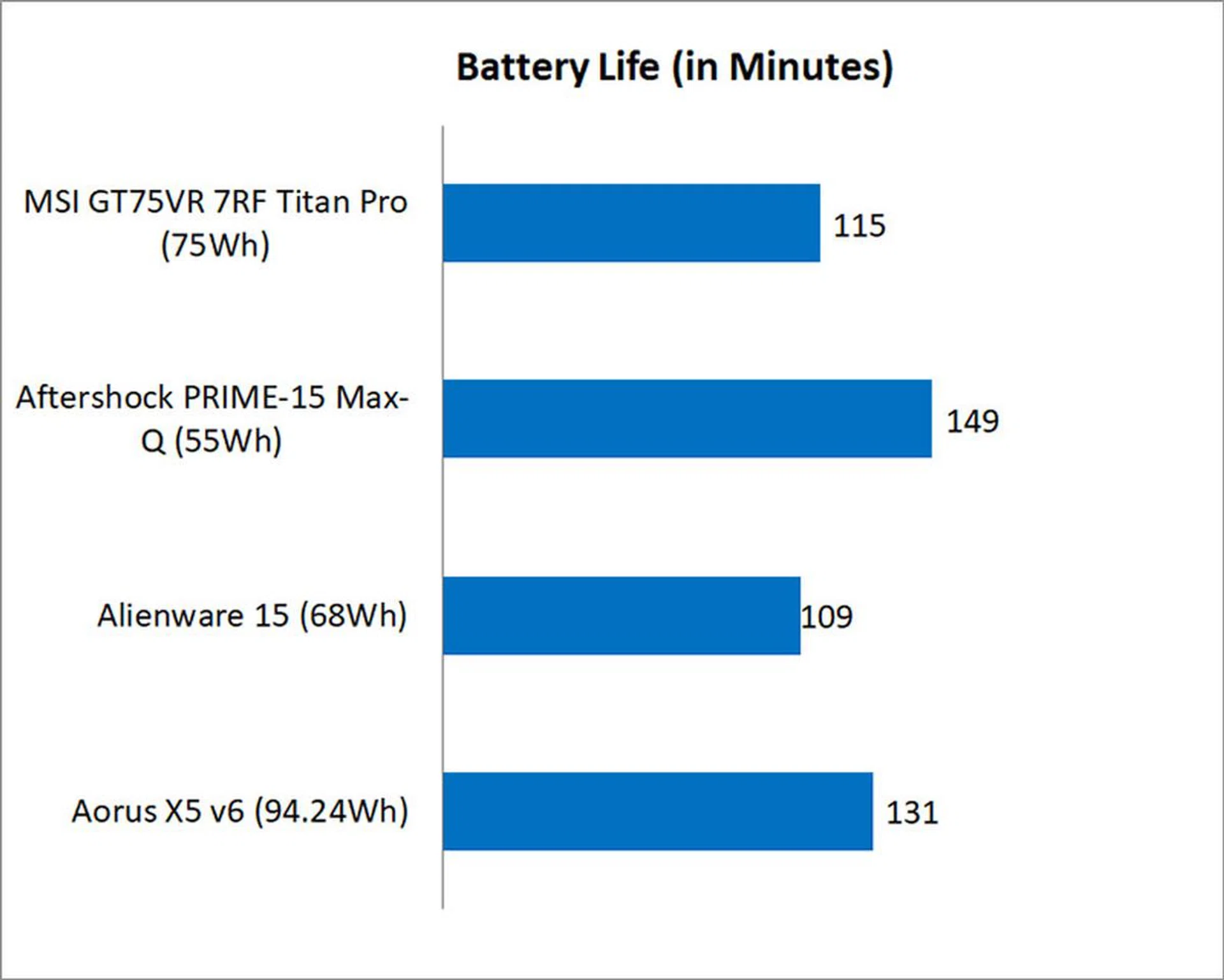 MSI equipped the Titan Pro with a mid-sized 75Wh battery, and it lasted for just under two hours, which isn’t a great result. That said, it seems unreasonable to expect more from a notebook of this class, and its result wasn’t that much worse than the Aorus X5 v6, which although it runs on last generation’s processor, has a larger battery pack.