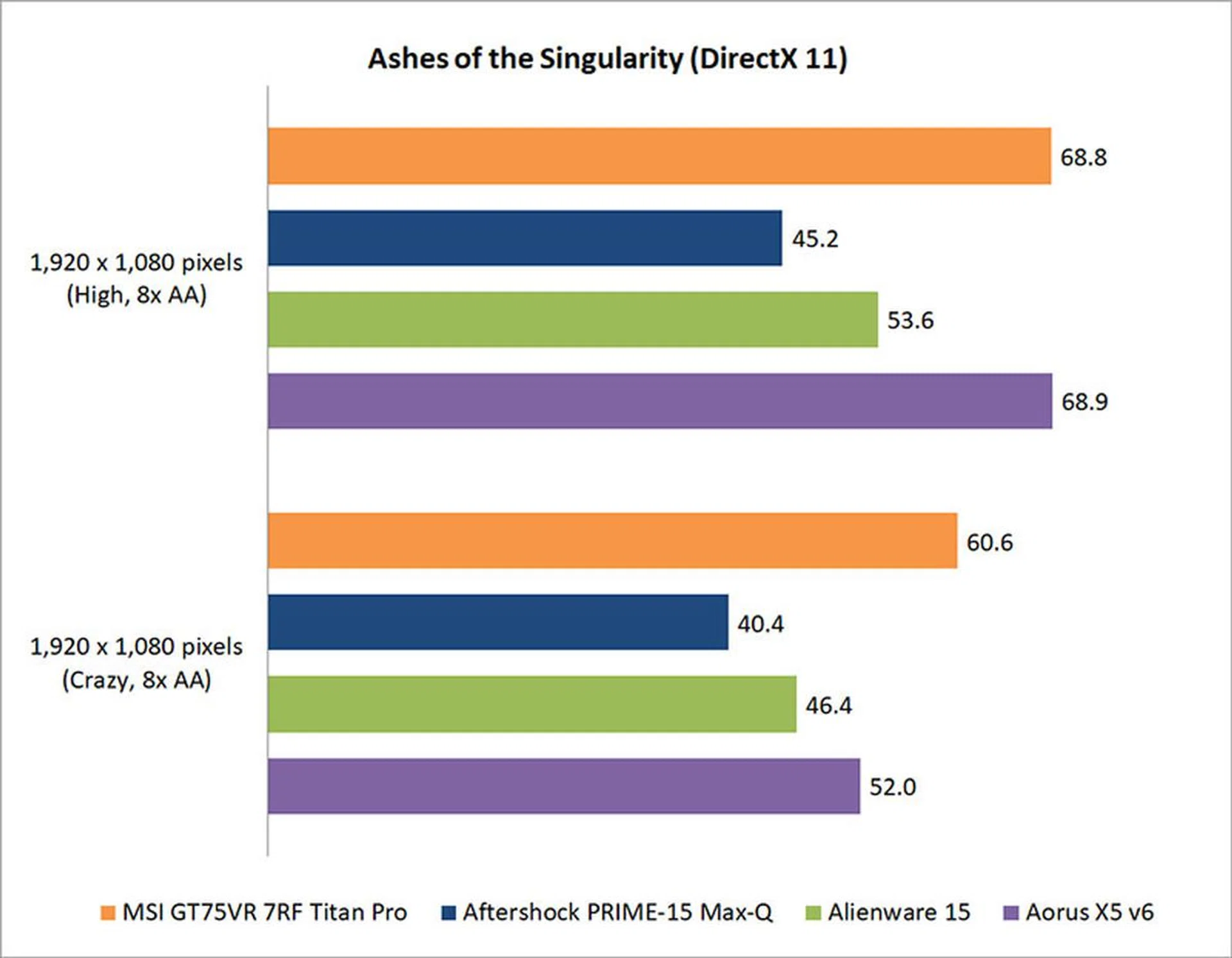 We used the Aftershock PRIME-15 as our main comparison, but we’ve also included figures from other non-Max-Q GeForce GTX 1070 notebooks to flesh out the results where available. Specifically, we picked the Aorus X5 v6 and Alienware 15, equipped with a Core i7-6820HK and Core i7-6700HQ respectively, to help with the comparisons. These are 6th-generation processors, but because most games are GPU-bound, their performance can be taken as an approximation of what you can expect from their current 7th-generation counterparts.