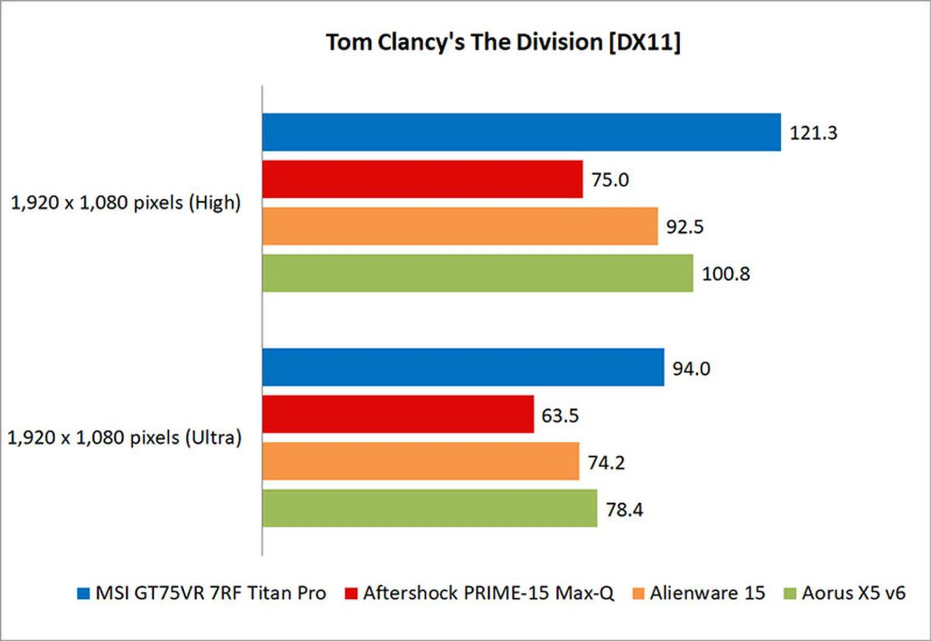 Unsurprisingly, the MSI Titan Pro again took the lead in The Division. Things can get quite hard on the GPU at Ultra settings, but the GeForce GTX 1080 handles it with ease, posting a nearly 20 per cent lead over the Aorus X5 v6.