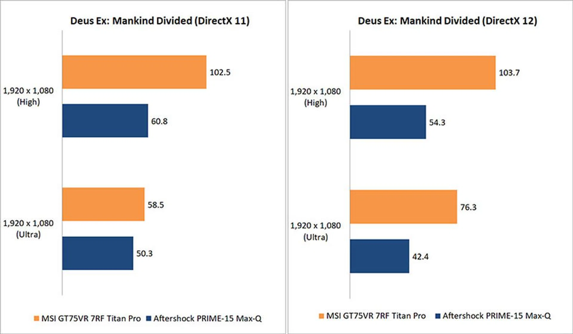 On the other hand, Mankind Divided is one of the most demanding games out there. It pushes the GPU hard, and utilizes a range of advanced graphical effects such as dynamic and volumetric lighting and cloth physics. Unfortunately, we don’t have figures from the Alienware and Aorus laptops, so there’s just have the Aftershock PRIME-15 for comparisons here.