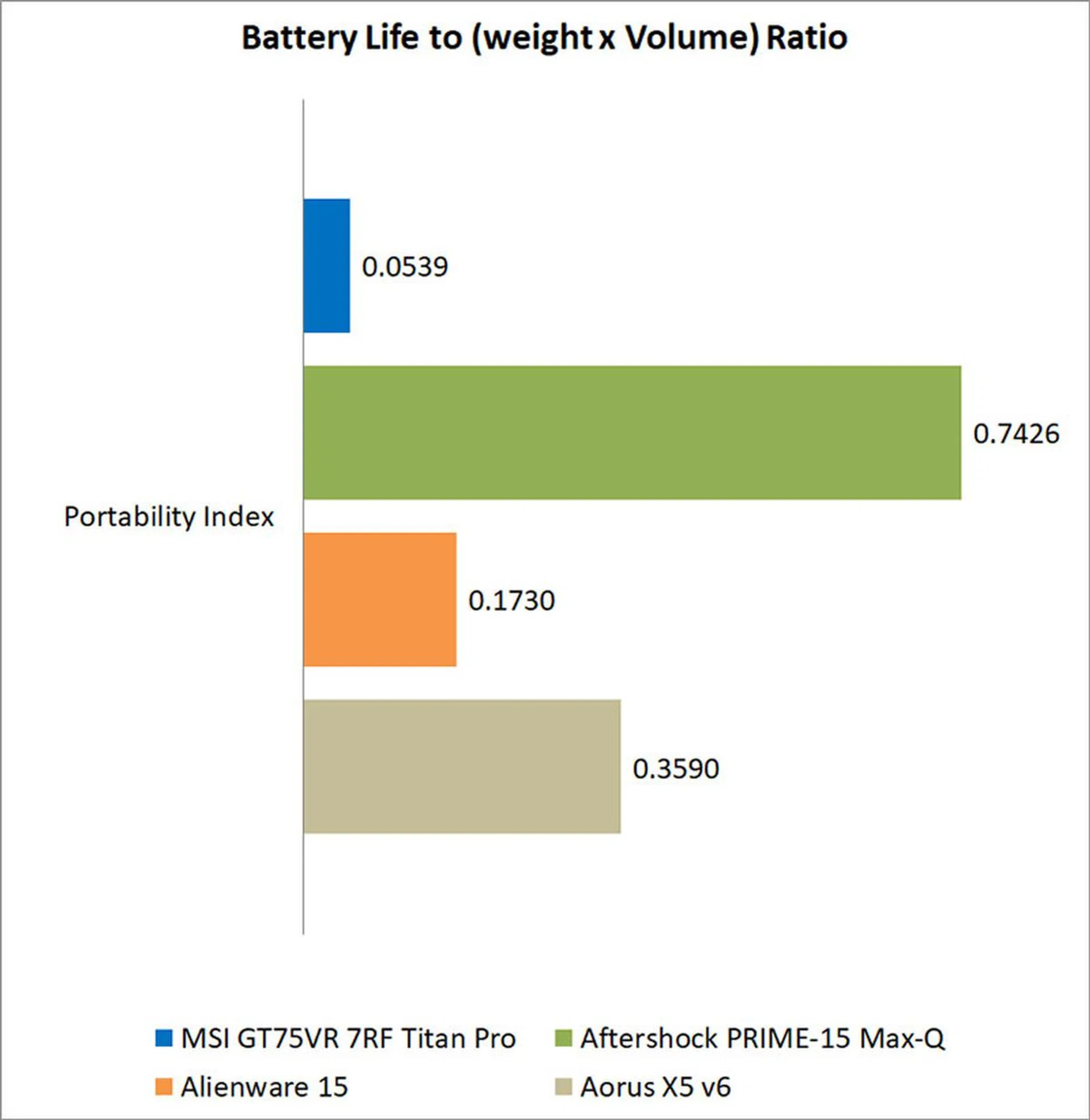 It’s probably no surprise that the MSI GT75VR 7RF Titan Pro did so poorly here, ranking last in a category of products that isn’t exactly known for being portable. It’s weight and dimensions literally drag it down from the start, and even if it somehow had great battery life, we can’t see anyone toting this around in a backpack. While the result isn't totally unexpected, it actually fared lower than most other DTR-class notebooks we've tested in the past (refer to the Portability Ratio reported across various notebooks in this older review).