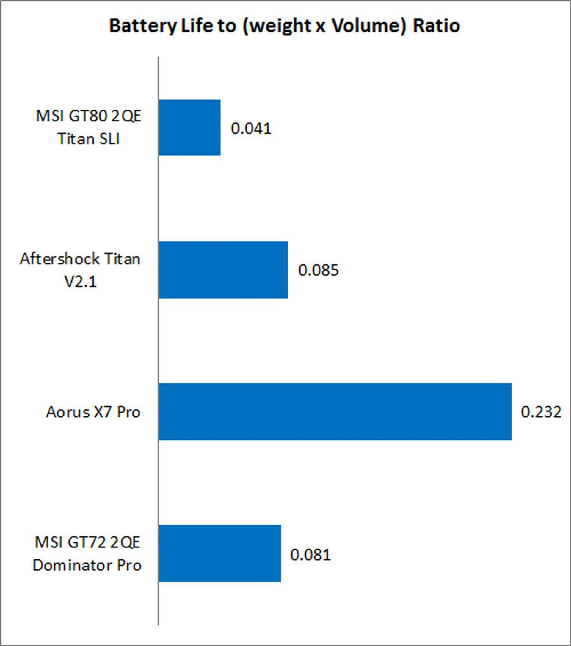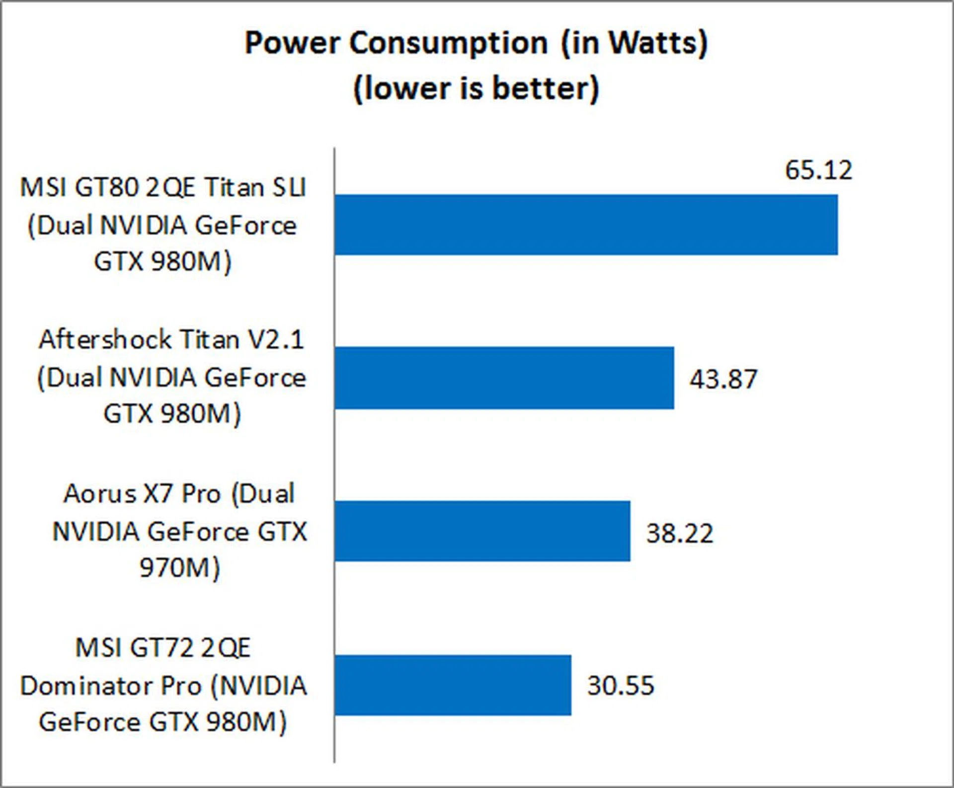 The Aftershock V2.1 comes closest but its power consumption figure of 43.87W is over 30% lower and the two have very comparable hardware and even almost the same battery capacity (88Wh in the GT80 Titan SLI vs. 89Wh in the Titan V.2.1). Clearly, the GT80 Titan SLI is not as well optimized.