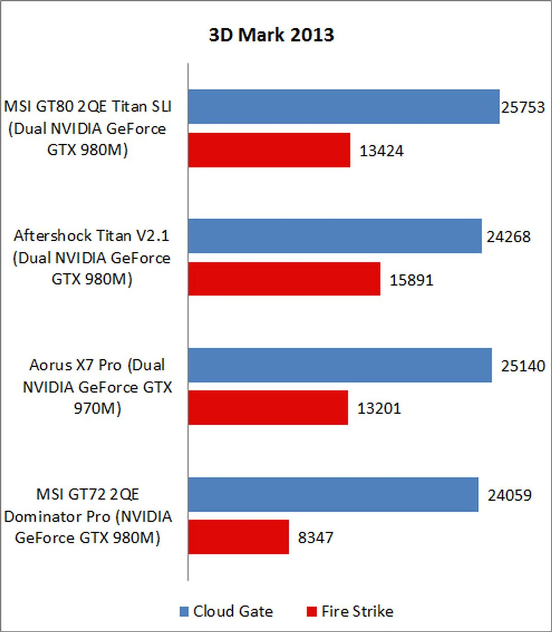 The 3D Mark 2013 test produced very surprising numbers, with the GT80 Titan SLI outperforming everybody in the category. That's not the surprise though. The surprise instead comes from its incredibly low score in Fire Strike, the most GPU intensive test on 3D Mark 2013. In that test, the machine barely performs better than the SLI NVIDIA GeForce GTX 970Ms in the Aorus X7 Pro. We did the test twice (the second time getting 13354, which is even lower) so it definitely wasn't a fluke. After much discussion, we settled on theory that the temperature might be the reason the GT80 is not delivering. NVIDIA has a feature called GPU Boost that takes temperature into account as well as available power when overclocking the GPU. As the GT80 Titan SLI is running slightly hotter (as we would see later), this could be a reason why the GT80 Titan SLI was underperforming. We noticed that the same thing happened in 2013, when we did our gaming notebook shootout.