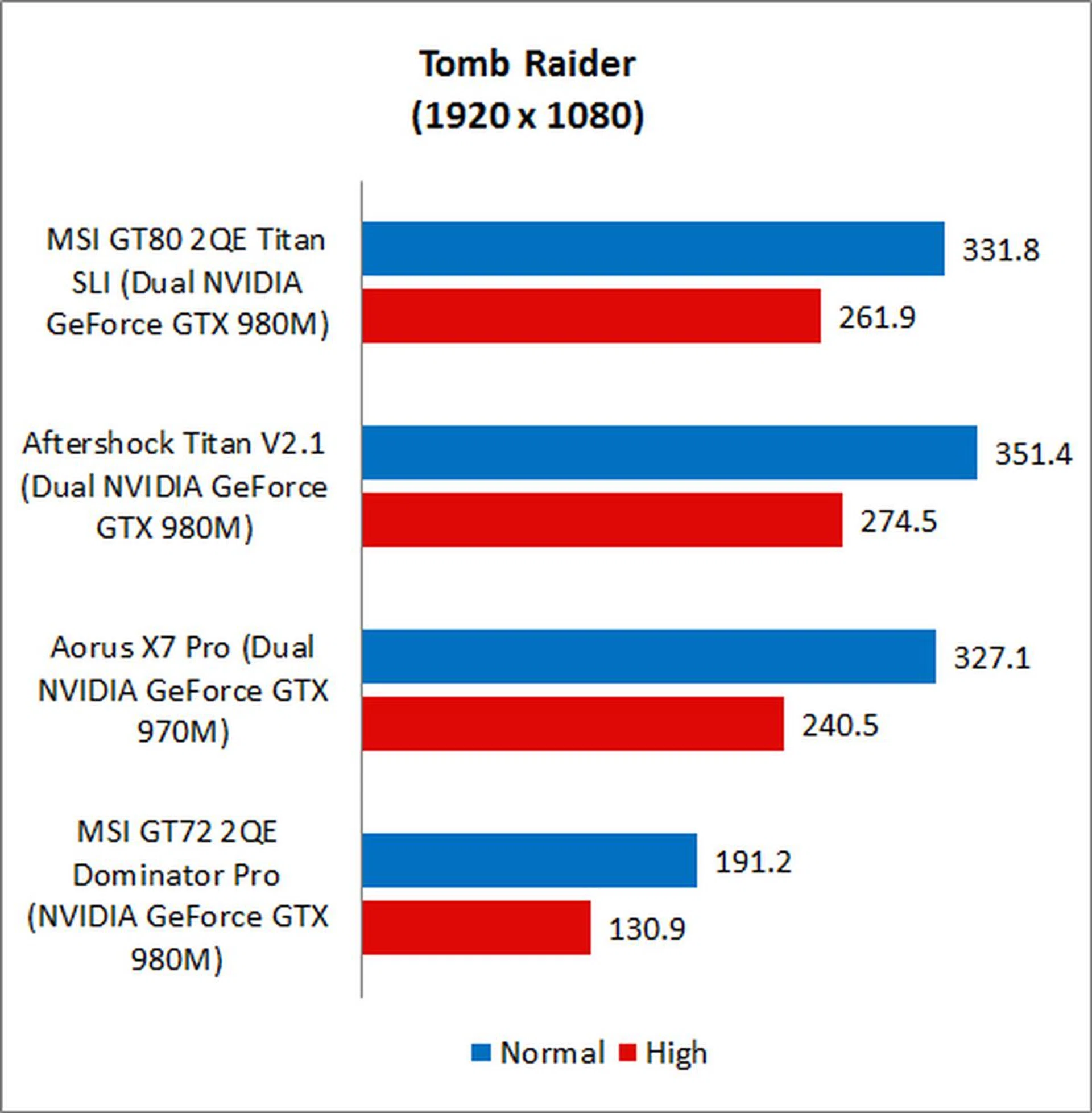 Tomb Raider proved that that there might be something wrong with the GT80 Titan SLI during the Fire Strike test. Even thoughs the numbers we got from Tomb Raider's benchmark had it performing markedly better than the Aorus X7 Pro, though it still lags behind Aftershock Titan V2.1, on both Normal (by about 5.9%) and High resolutions (by about 4.81%).