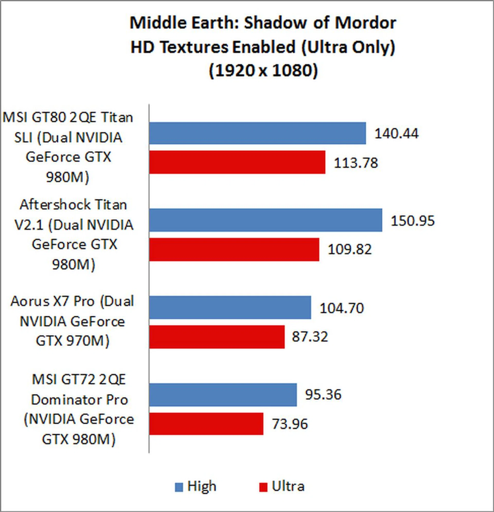 We saw less of a performance gap here between the two SLI NVIDIA GeForce GTX 980M machines. Both there Aftershock and MSI machines are neck and neck, with around 11 FPS or 7% difference between them on High. Ultra sees the MSI GT80 Titan SLI pulling ahead, though the negligible difference (5 FPS or about 3.6%) doesn't make much of a difference.