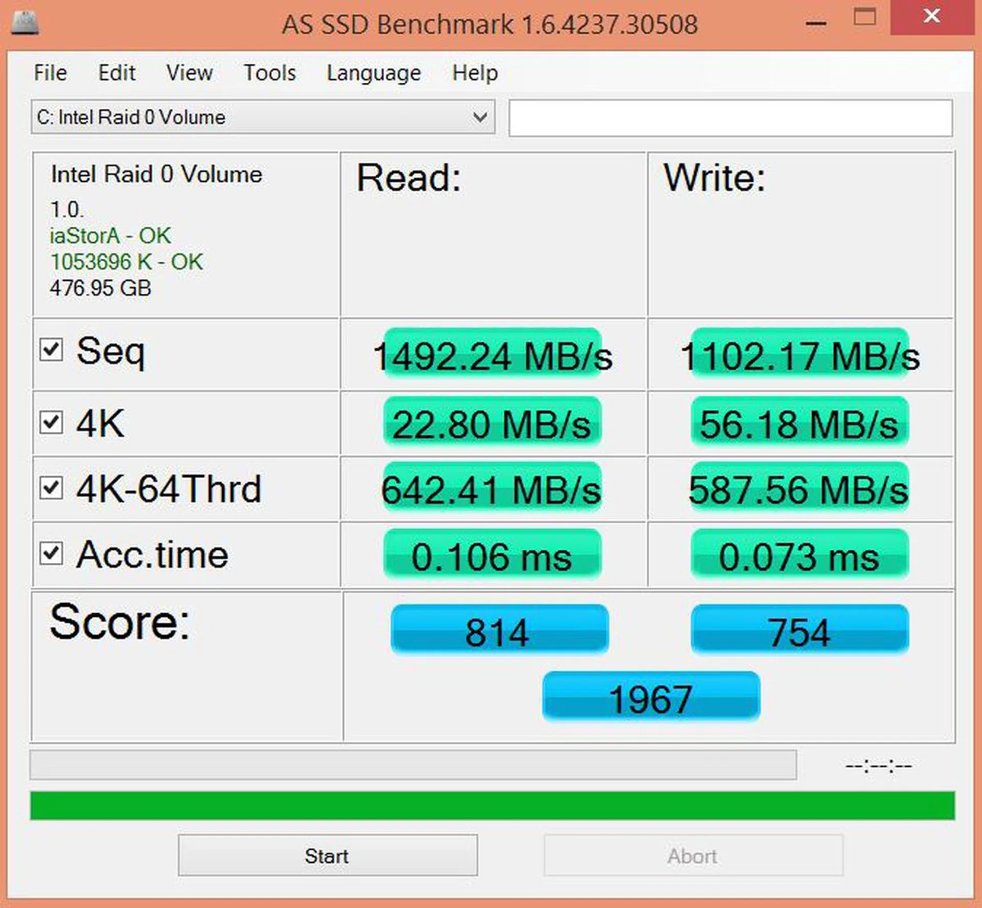 Our highest spec GT80 Titan SLI comes with one of Intel's most powerful mobile processor, the quad-core Core i7-4980HQ (2.8GHz, 6MB cache). The GT80 Titan SLI also comes with 32GB of RAM and two NVIDIA GeForce GTX 980M in SLI. The storage system is particularly impressive as it has four M.2 128GB SSDs configured in a RAID 0 array for a total capacity of 512GB. The SSDs in use here are from Kingston and uses Phison PS3108-S8 controllers, the same used in the recently reviewed Silicon Motion S80 SSD, which we found to be unimpressive. We ran a simple test to gauge its performance, and as expected, sequential read and write speeds were very impressive, but results in the other workloads were less so - 4K reads and writes were particular slow. To complement the flash storage, MSI has also equipped the machine with a single 1TB 7200rpm HDD.