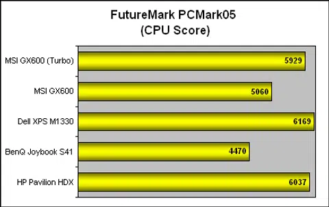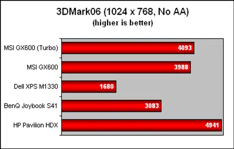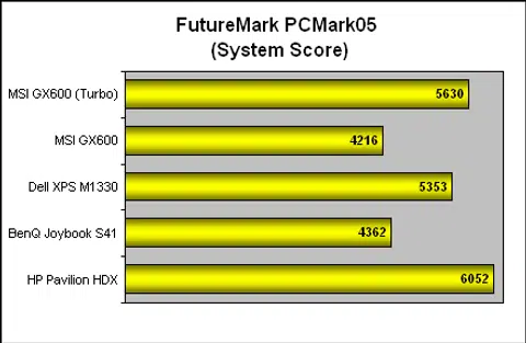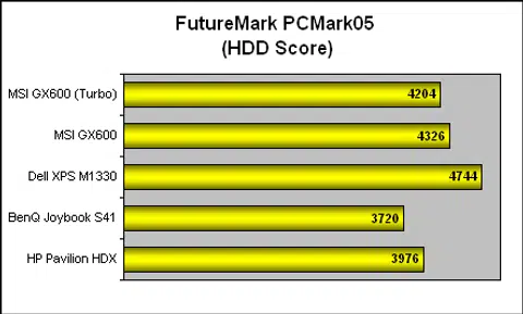 We did try our latest copy of MobileMark 2007 on the MSI GX600 but ran into some issues during installation and had to abandon it in favor of PCMark05, which had been the only synthetic system benchmark that is supported in Vista. We first ran the GX600 in its default setting and then tried its Turbo mode. This brought along a jump in performance as these graphs illustrate. Both the Dell and HP were clearly faster than the MSI GX600 in its normal state, though all three produced very close scores once Turbo was enabled. Having a 7200RPM hard drive was also a significant boost for the Dell and more than anything suggested by these scores, it will probably have the most visible impact on user experience.