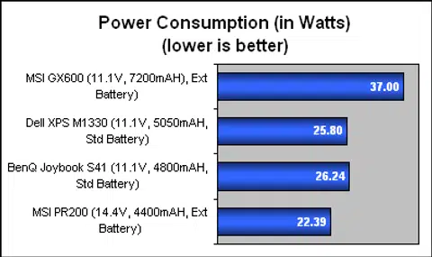 From the specs of the battery, we also managed to determine the average power consumption of the MSI GX600, which was significantly higher than its non-gaming counterparts. The bigger screen and the more powerful graphics on the GX600 probably accounted for much of its greater power consumption numbers.