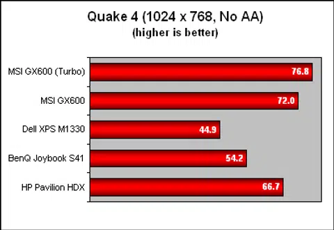 Since the GX600 is first and foremost a gaming notebook, we have included a couple of games along with the standard 3DMark benchmark. Even without Turbo, the GX600 is already among the leaders in our graphs, with the HP Pavilion HDX the closest challenger due to its mid-range Radeon HD 2600 XT GPU. As seen from the Quake 4 scores, Turbo did produce a few more frames though the newer benchmark here, the beta version of Unreal Tournament 3 showed that increasing the CPU speed may not work all the time, suggesting that new games will lean more heavily on the GPU. In a roundabout way, it does give the GX600 an edge, since it's graphics chipset is definitely one of the better ones currently.