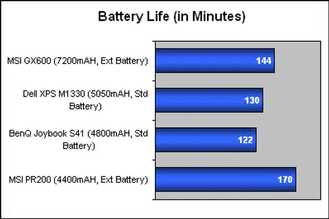 Despite a 9-cell battery, the MSI GX600 only lasted 144 minutes on MobileMark 2007's DVD playback/battery life test segment.